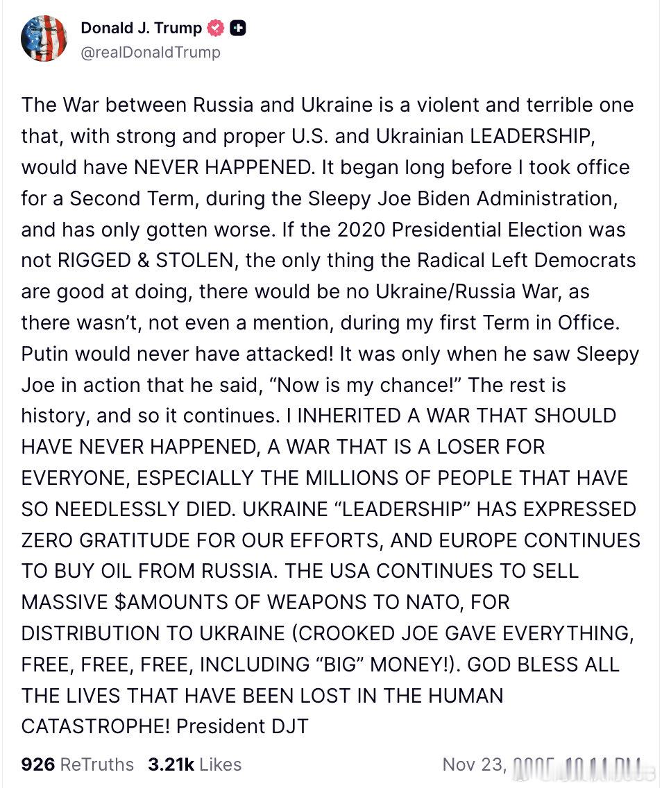 特朗普猛烈抨击:基辅方面“毫无感激之情”------据美国有线电视新闻网(CNN)最新消息,美国总统特朗普23日猛烈抨击乌克兰领导层,称其对美国的相关努力 “毫无感激之情”。目前,美国高级官员正与基辅代表团会面。特朗普在社交平台发文表示:“乌克兰‘领导层’对我们的努力毫无感激,而欧洲仍在购买俄罗斯的石油。”。
