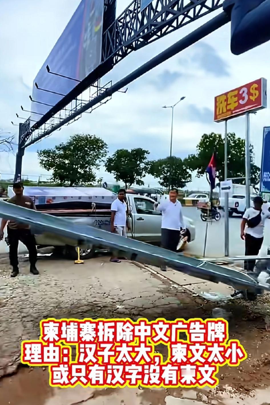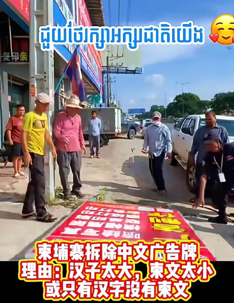 柬埔寨拆除中文告牌,理由是:汉字太大,柬文大小或只有汉字没有柬文 柬埔寨有明文规定,所有广告柬埔寨文字必须大于外国文治,柬埔在文字必须在上面。只是前几天不还在宣传欢迎去旅游啊,这变脸速度比变天都快。中文用了那么多年也没能改变什么,二代上来改用英文 之前胡志明住柳州的时候也是非常崇拜汉字的,后来一滚回越南就开始废除汉字了,后来越南还想去南宁过春节,再后来的事大家都知道了吧 在中国英文标到处都是 ,不管是商场,楼层, 医院,甚至是警车, 警服,都有英文标。连我们厕所不用汉字却用英文标识动不动什么与国际接轨。方便了外人却难为自己人,结果是里外不是人。