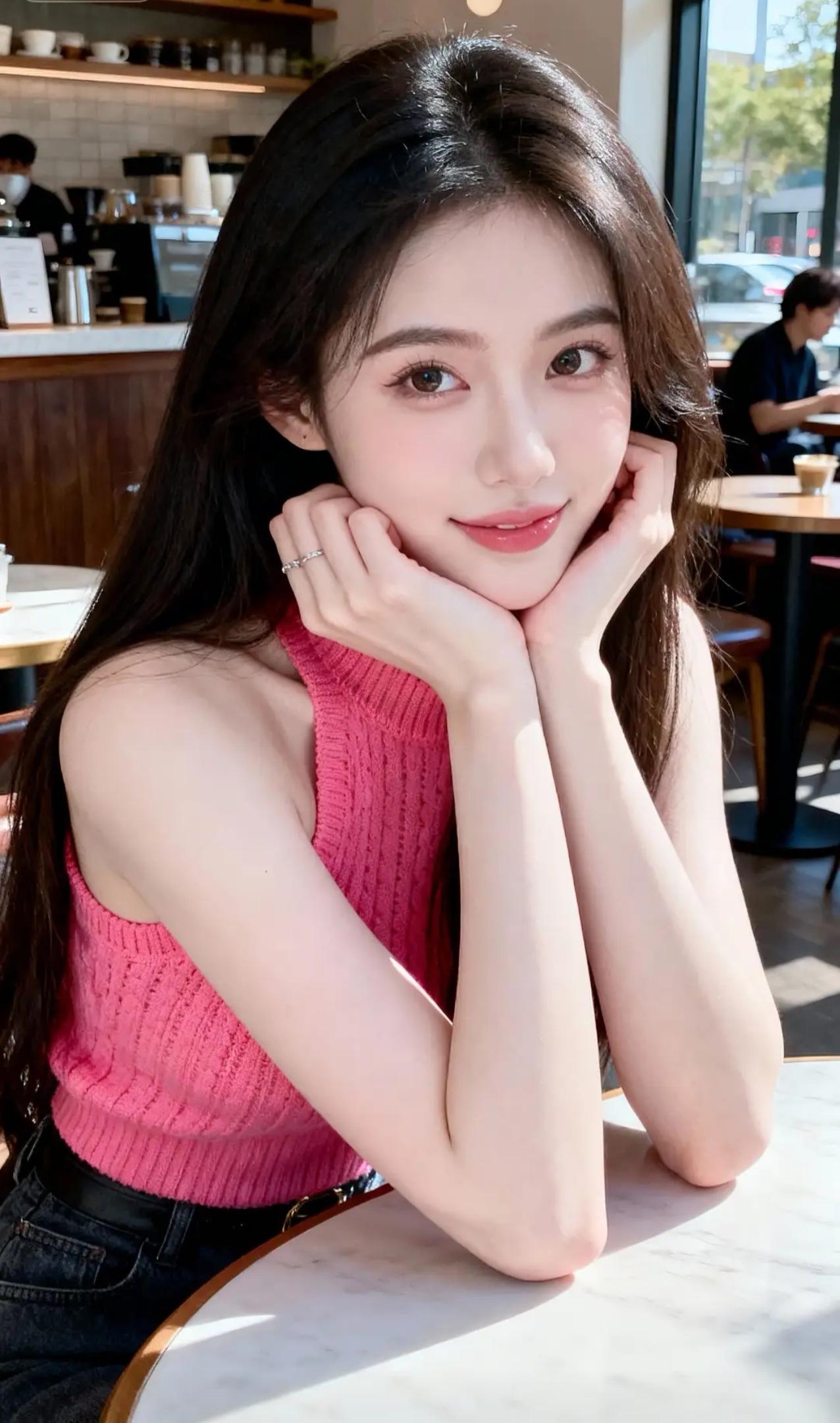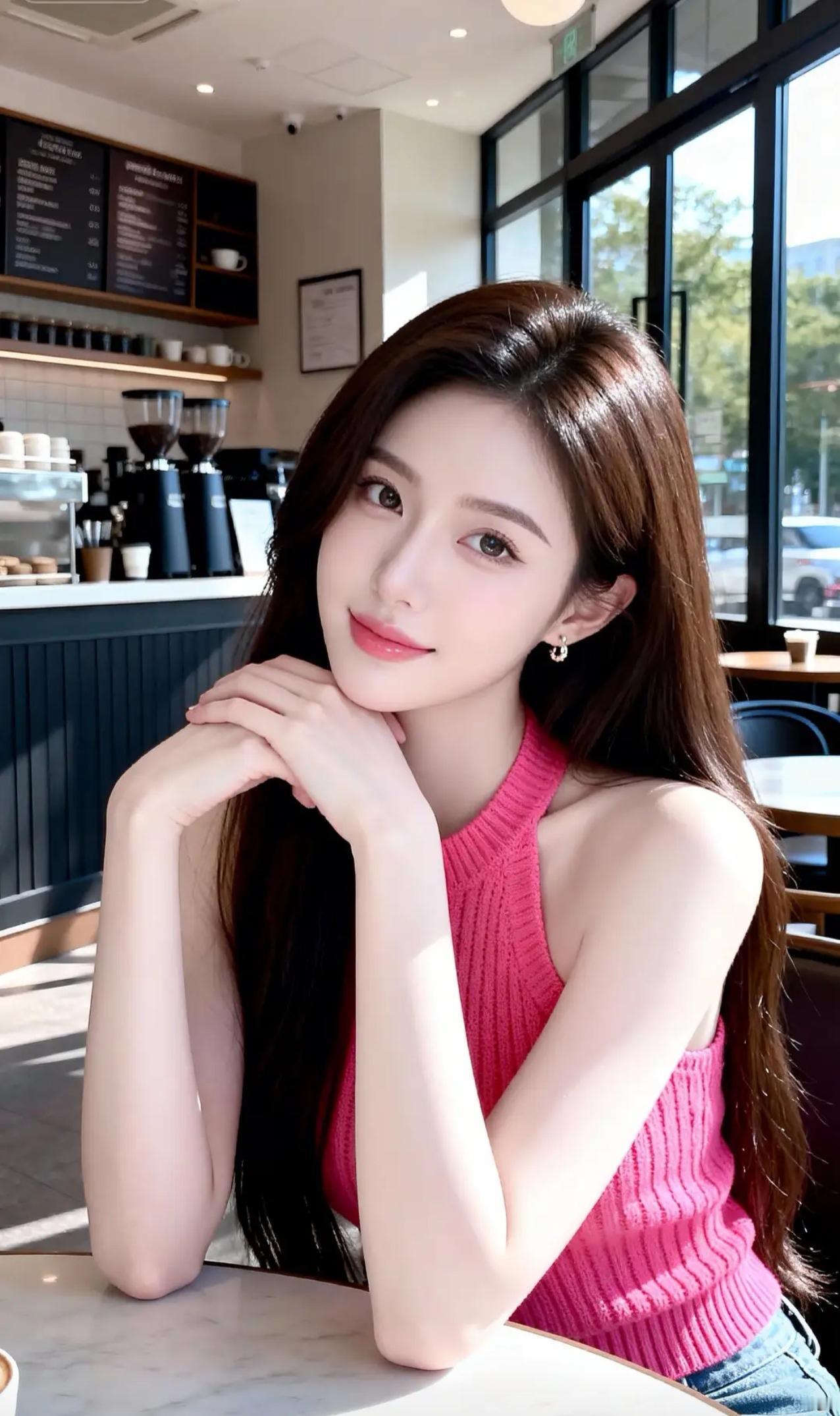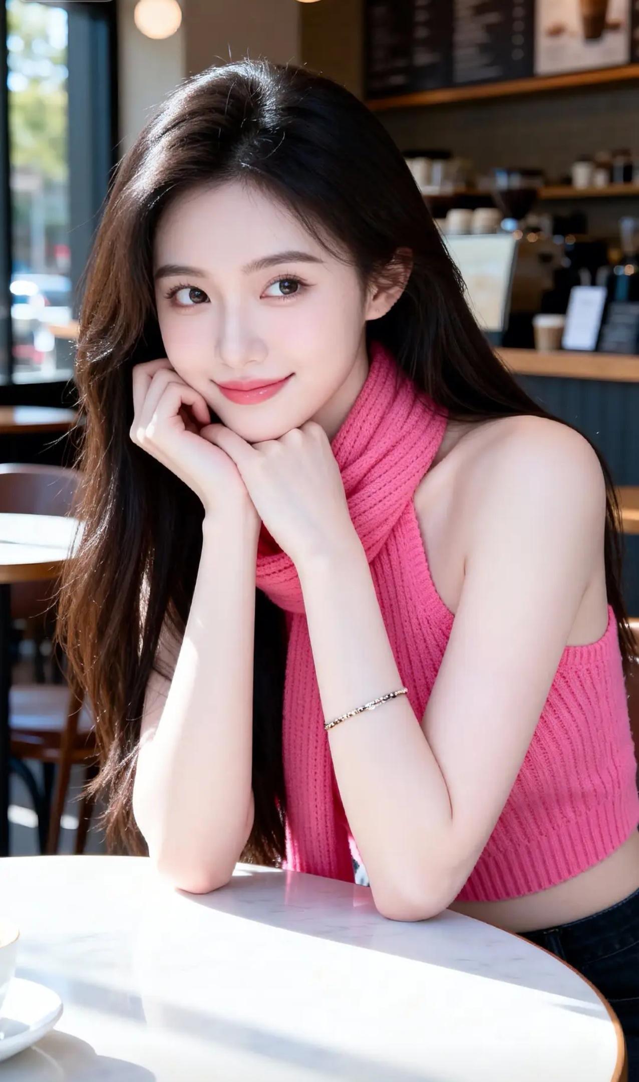 午后的阳光像融化的蜂蜜,透过落地窗在木纹桌面上流淌。我托着下巴,指尖能感受到针织毛衣柔软的触感,露肩设计让阳光在锁骨上跳起圆舞曲。吧台后的咖啡机正发出温柔的轰鸣,空气里漂浮着焦糖与可可豆交织的香气,像首未写完的十四行诗。 深色长发垂落时,发梢扫过肩头的粉红毛线,那是去年冬天妈妈亲手织就的温暖。玻璃杯壁上凝结的水珠正沿着杯壁滑落,在桌面晕开小小的圆。窗外梧桐树的影子被风揉碎,斑驳的光影在白色瓷盘上跳格子,让我想起童年时总也数不清的跳房子格子。 当拿铁拉花上的心形渐渐消散,我忽然注意到吧台后那排马克杯的秘密——每个杯底都藏着店员手绘的迷你笑脸。最角落的蓝色杯子上,有人用银色马克笔写着"此刻即永恒",字迹被咖啡渍晕染得有些模糊,却让整个空间突然有了时光的质感。 邻座老先生的报纸翻动声惊醒了沉思,他手边的司康饼碎屑落在《百年孤独》的书页间。我望着他布满皱纹的手端起骨瓷杯,突然听见时间在杯碟碰撞中发出清脆的回响。窗外的云朵正慢慢踱过天际,像一群不赶时间的绵羊。 当夕阳给咖啡馆镀上金边时,我的影子与桌椅的影子渐渐融为一体。吧台后的姑娘开始擦拭虹吸壶,玻璃器皿在暮色中折射出彩虹。我起身时,毛衣在椅背上留下淡淡的玫瑰香,而留在杯底的咖啡渍,正悄悄画着未完的句号。
