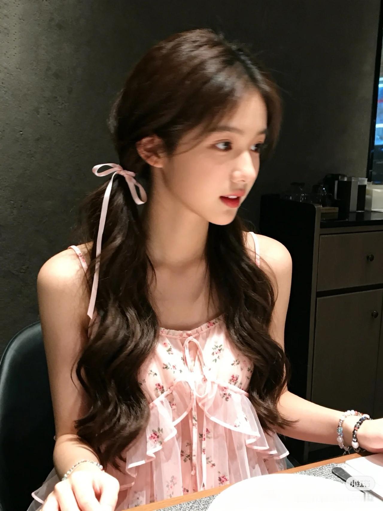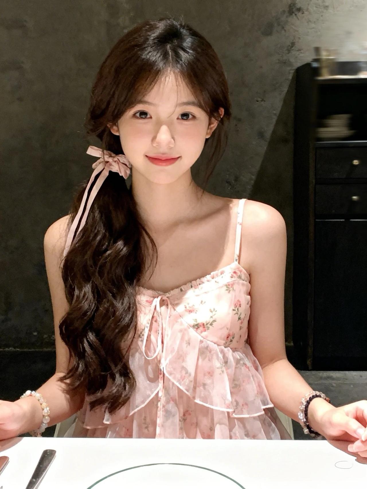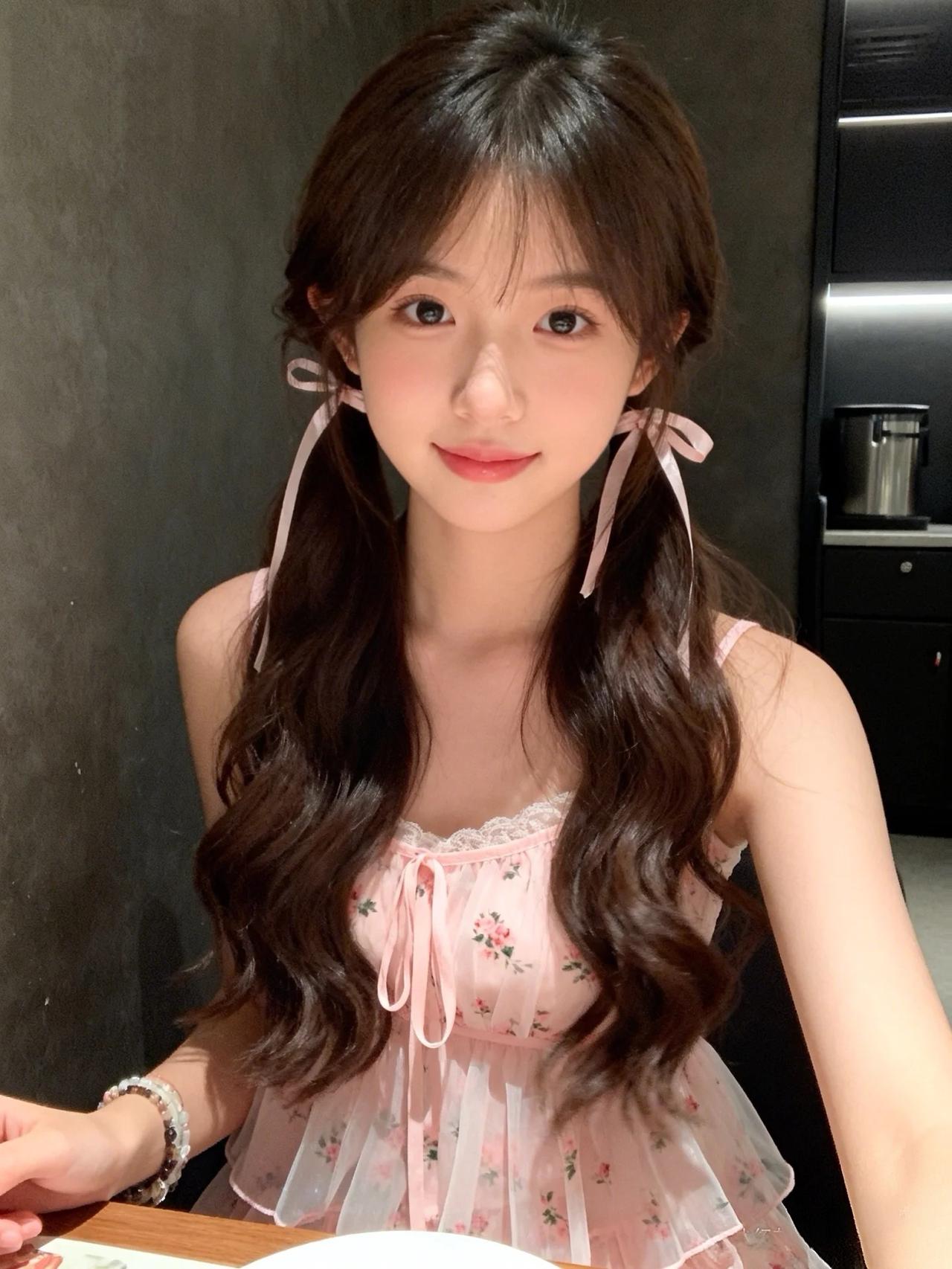 《甜梦微光》 深棕色的卷发如海藻般垂落肩头,发梢微微翘起的弧度带着少女特有的俏皮。粉色蝴蝶结发饰恰到好处地别在耳后,缎带在灯光下泛着珍珠般的光泽,随着她转头的动作轻轻颤动,像是栖息在发间的两只粉蝶。 粉色吊带裙上的矢车菊图案正盛开着,每一片花瓣都用银线勾勒出细腻的纹理。蕾丝花边沿着领口蜿蜒,在锁骨处织出镂空的藤蔓,阳光穿过蕾丝的孔隙,在她白皙的皮肤上投下细碎的光斑。裙摆自然垂落的褶皱里藏着光影的游戏,浅粉与深粉的渐变像被晚霞染过的云朵。 她手腕上的琉璃珠串折射出彩虹般的光晕,浅粉、乳白与淡紫的珠子交替串联,随着她托腮的动作轻轻碰撞,发出细不可闻的清脆声响。指甲盖上涂着透明的护甲油,在光线下泛着贝壳内壁般的虹彩。 深色墙面像天鹅绒幕布般衬托着这抹粉色,家电的金属边沿在背景里若隐若现,仿佛舞台剧的道具。整个画面被柔和的暖光笼罩,连空气都变得甜软,像是刚打开的棉花糖罐子,每个细节都浸在蜜色的光晕里。她嘴角的笑意比裙摆上的矢车菊更鲜活,眼波流转间,连时光都放轻了脚步。