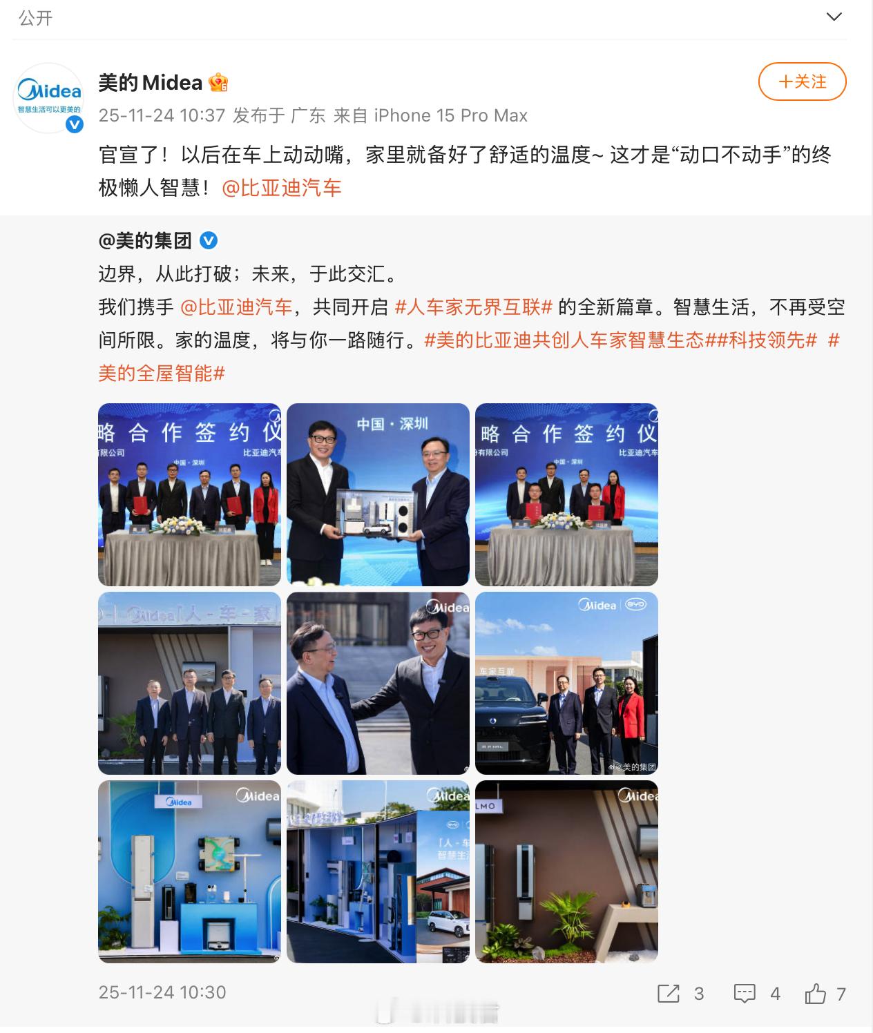 比亚迪和美的合作,打造人车家生态当我坐在车上,你好小迪,帮我打开客厅空调,并调至