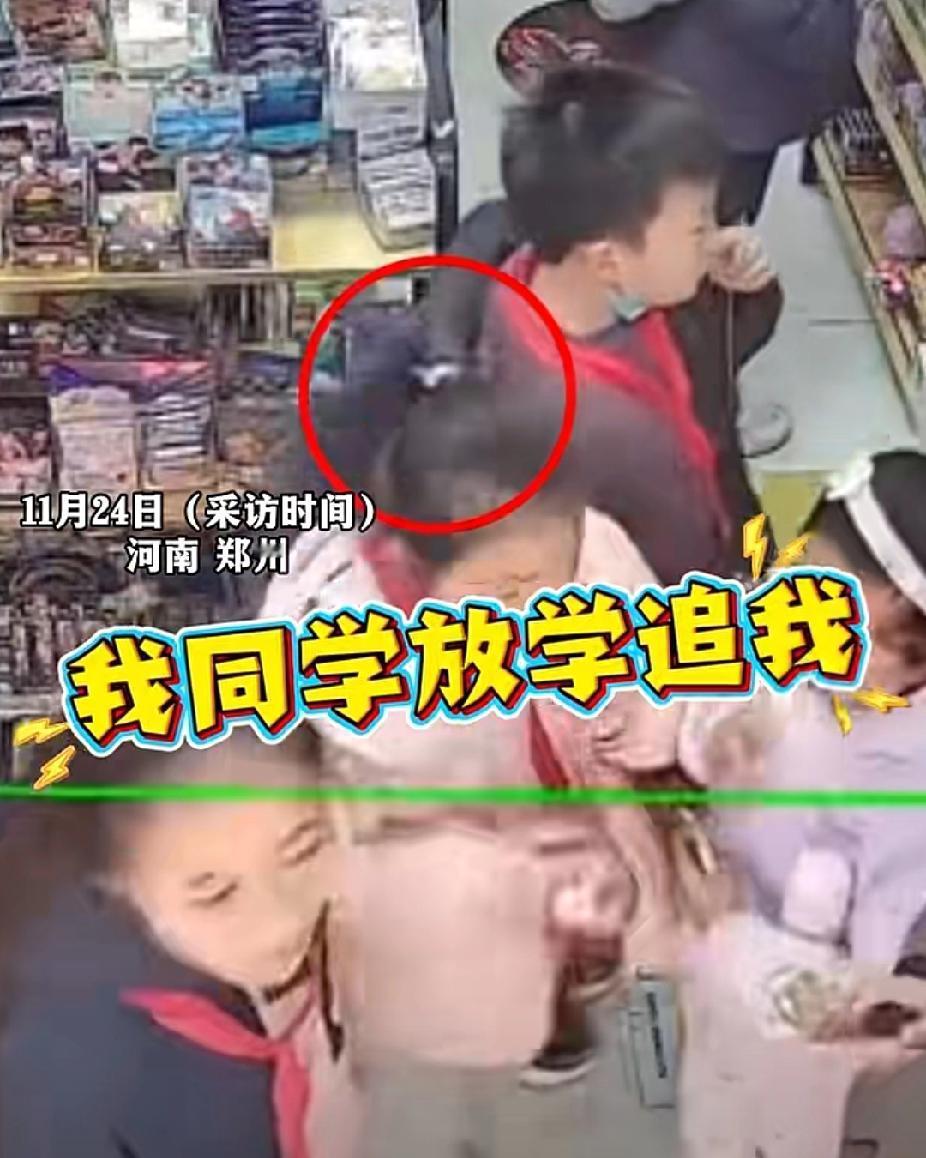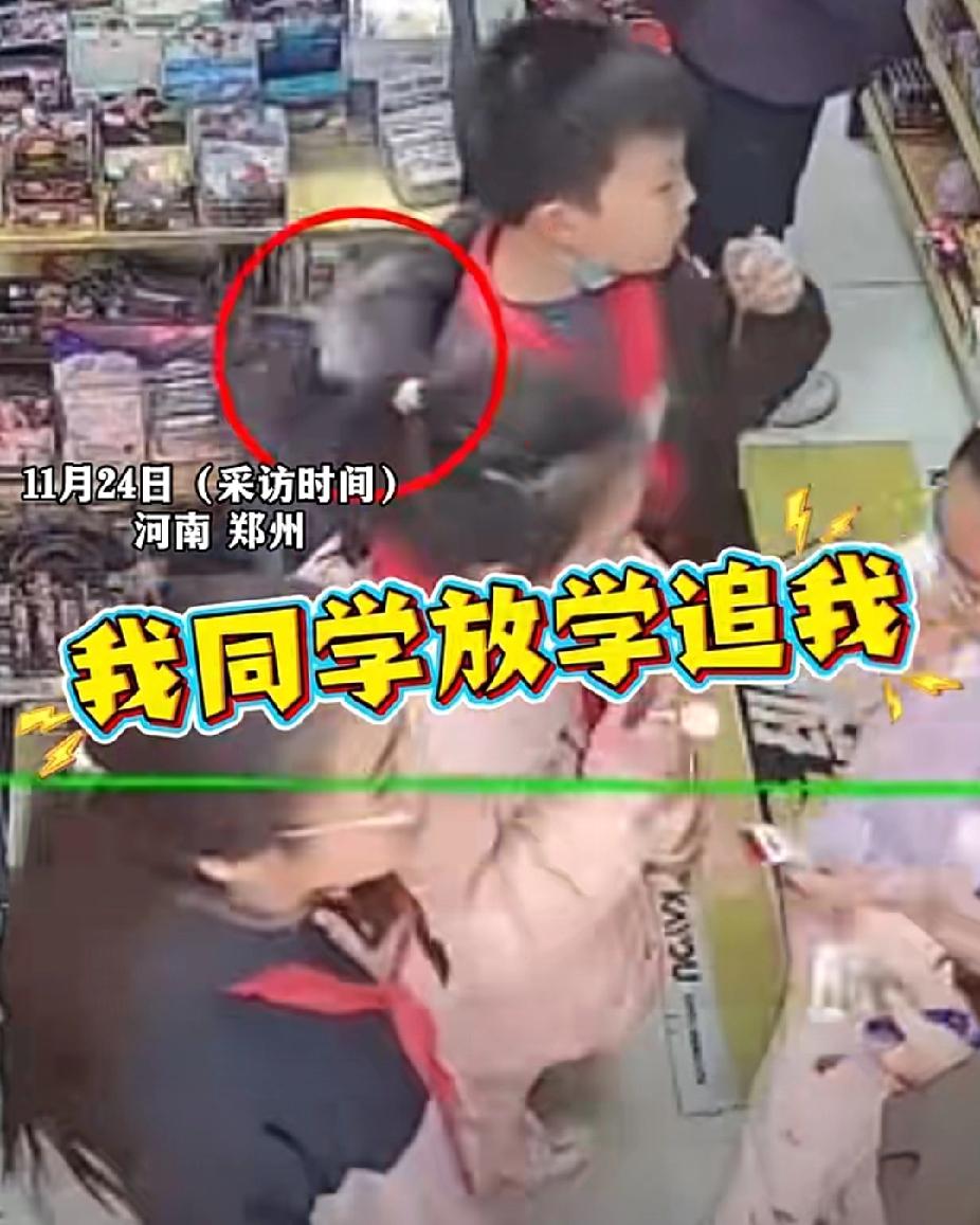 11月24日,河南郑州一男孩在文具店,货架物品“精准投送”进男孩帽子,老板娘看监