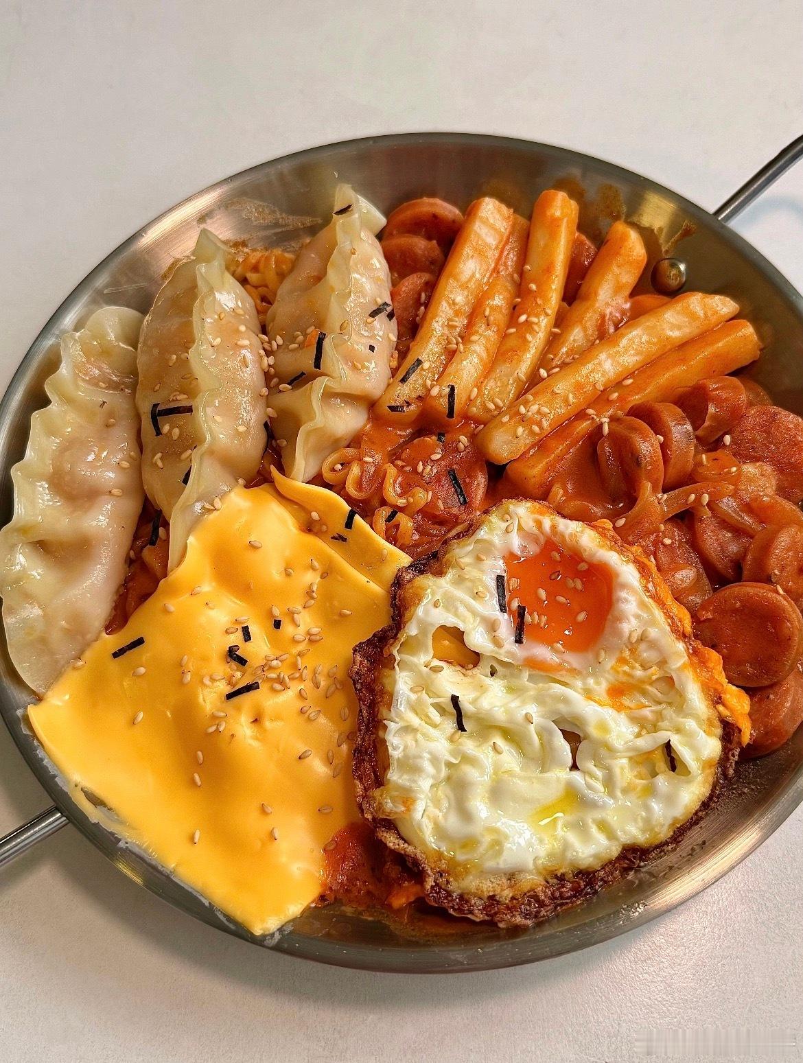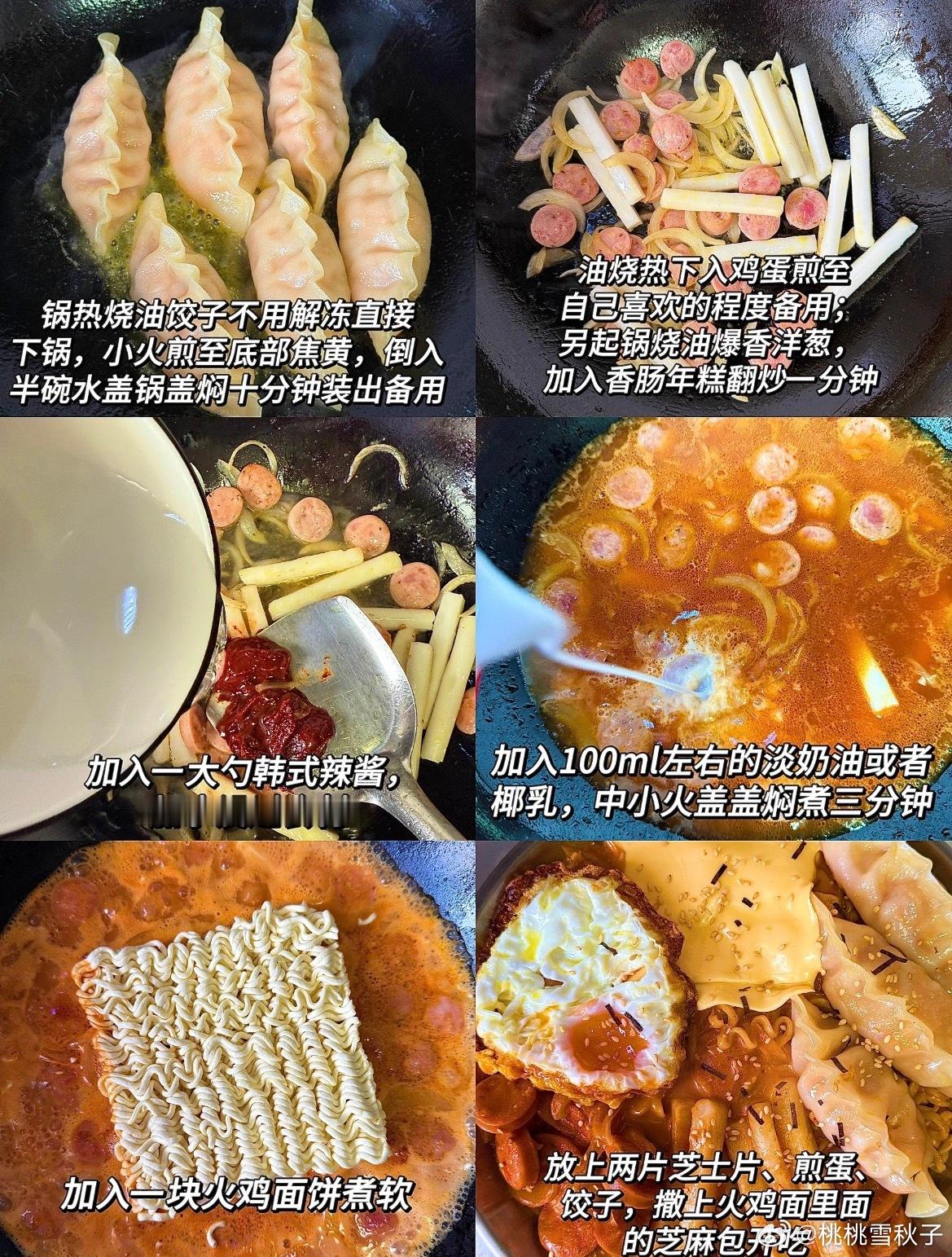 奶香浓郁,火鸡面黏糊糊,每一口都裹满了芝士辣奶油 。香肠和年糕拌上芝士,超满足🌟食材准备:洋葱、火鸡面、芝士片、饺子、鸡蛋、香肠、年糕、淡奶油或椰乳做法👇1️⃣锅热烧油饺子不用解冻直接下锅,小火煎至底部焦黄,倒入半碗水盖锅盖焖十分钟装出备用2️⃣油烧热下入鸡蛋煎至自己喜欢的程度备用3️⃣另起锅烧油爆香洋葱,加入香肠年糕翻炒一分钟 4️⃣加入一大勺韩式辣酱、100ml左右的淡奶油或者椰乳,加水没过食材中小火盖盖焖煮三分钟5️⃣加入一块火鸡面饼煮软,放上两片芝士片、煎蛋、饺子,撒上火鸡面里面的芝麻包开吃火鸡面狂热爱好者的最爱之一,宝贝们赶紧试试吧~