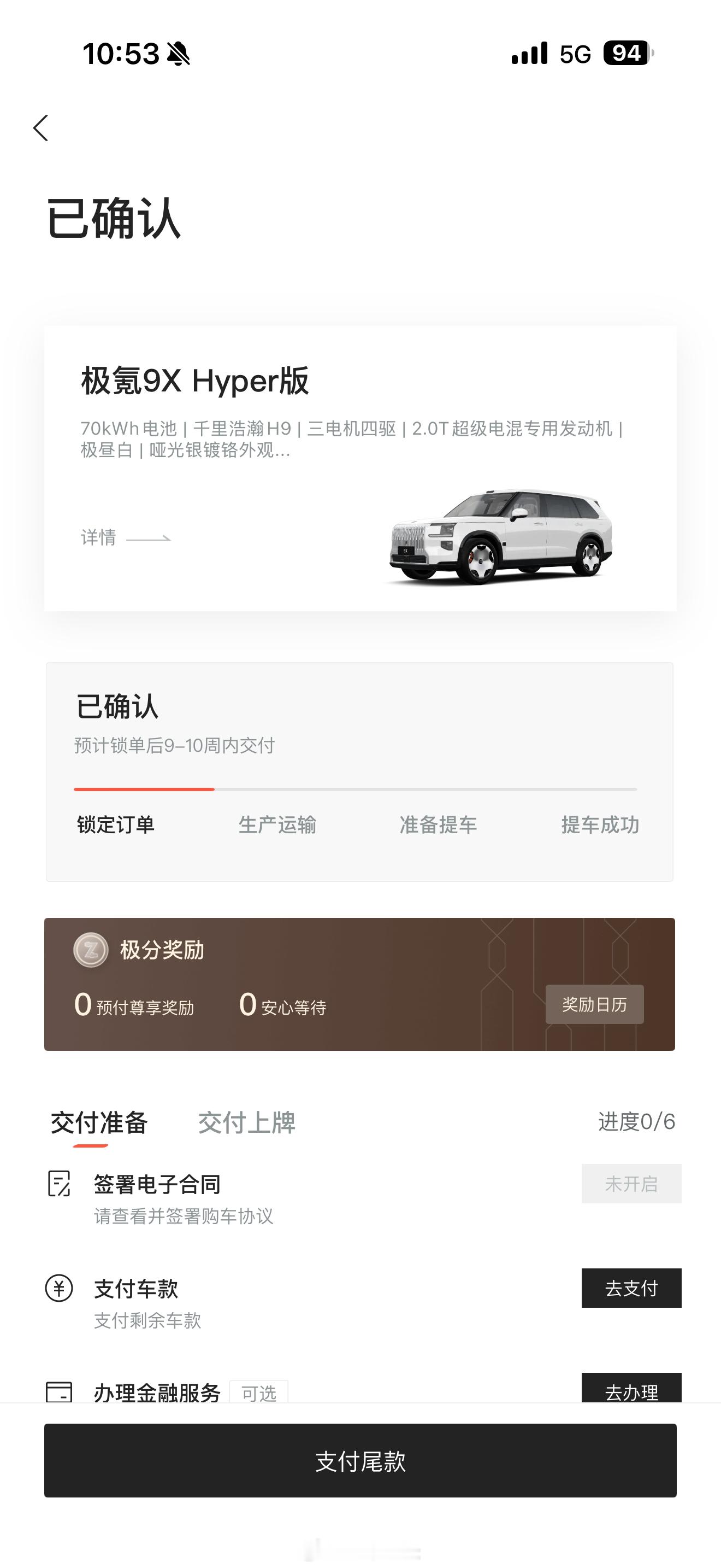极氪9X Hyper版还没交付信息,过两天就要出国了不知道12.2回来能不能提上。现在新锁单 Hyper和曜黑版已经要等23-26周了,整整半年。普通版本6-10周就行。
