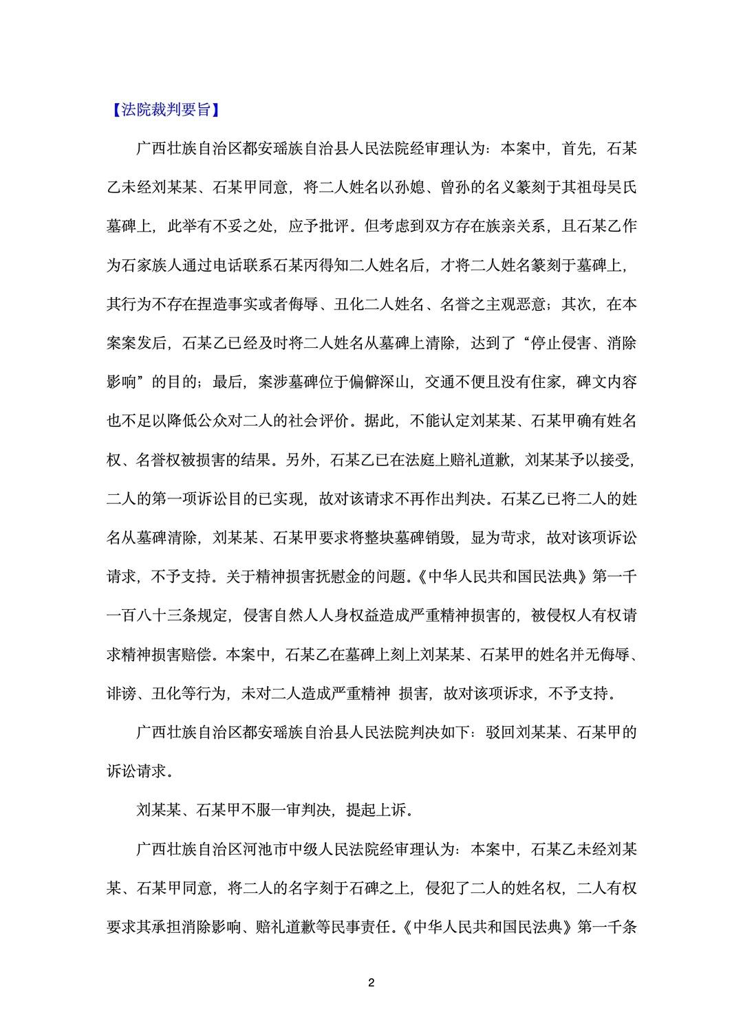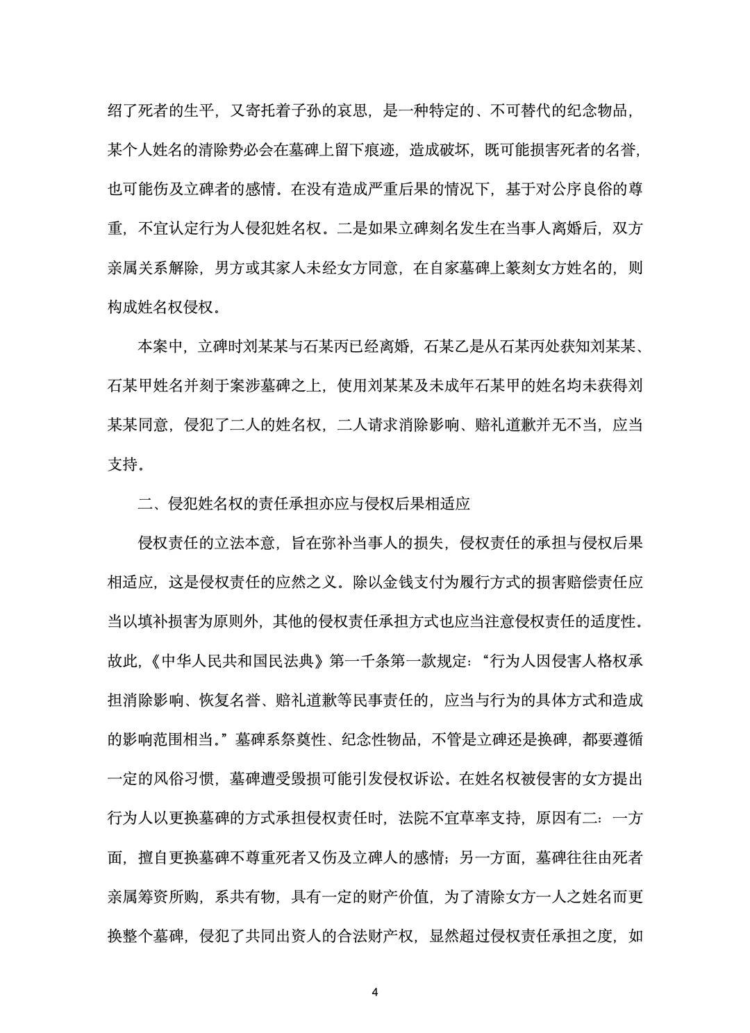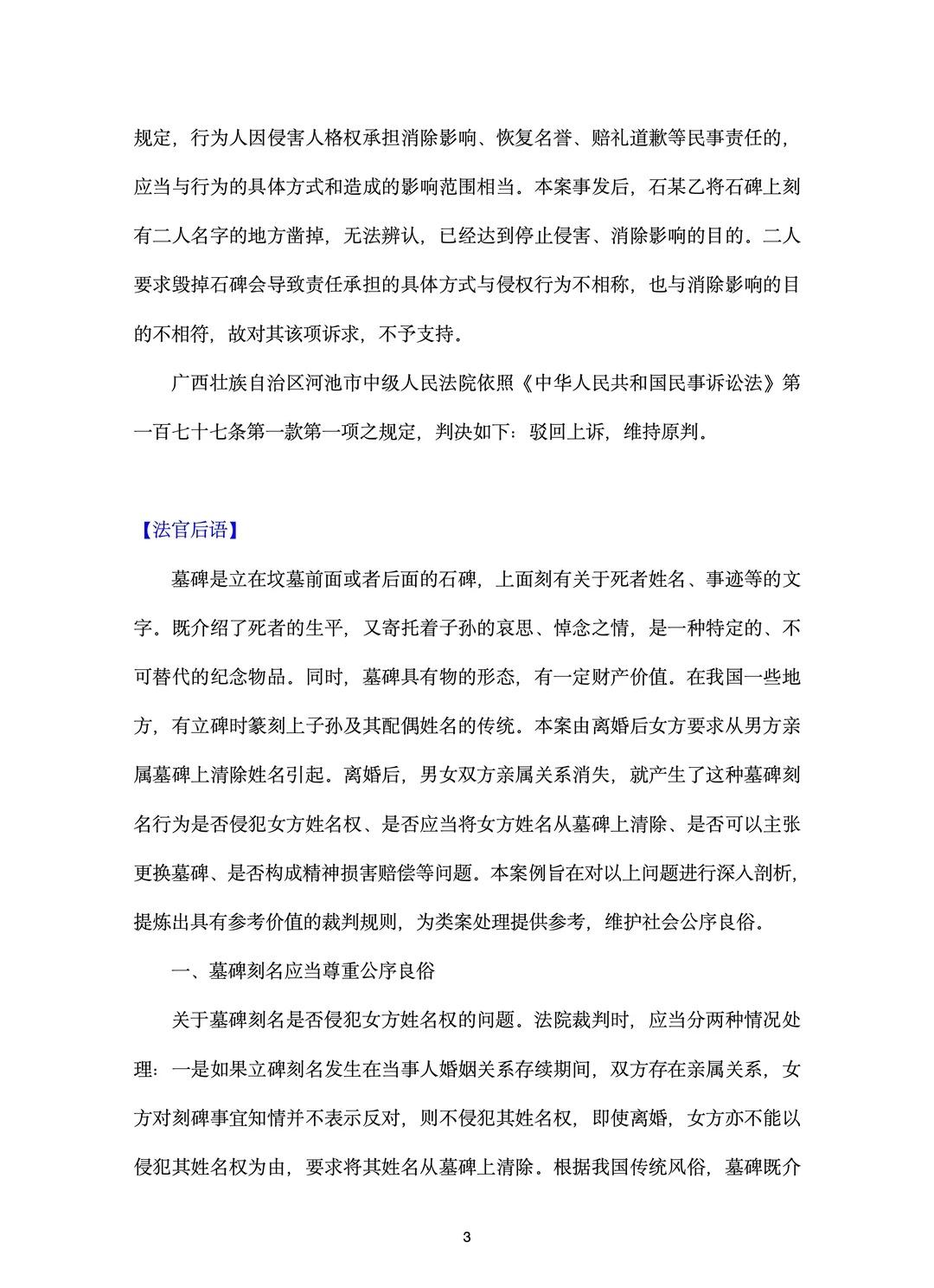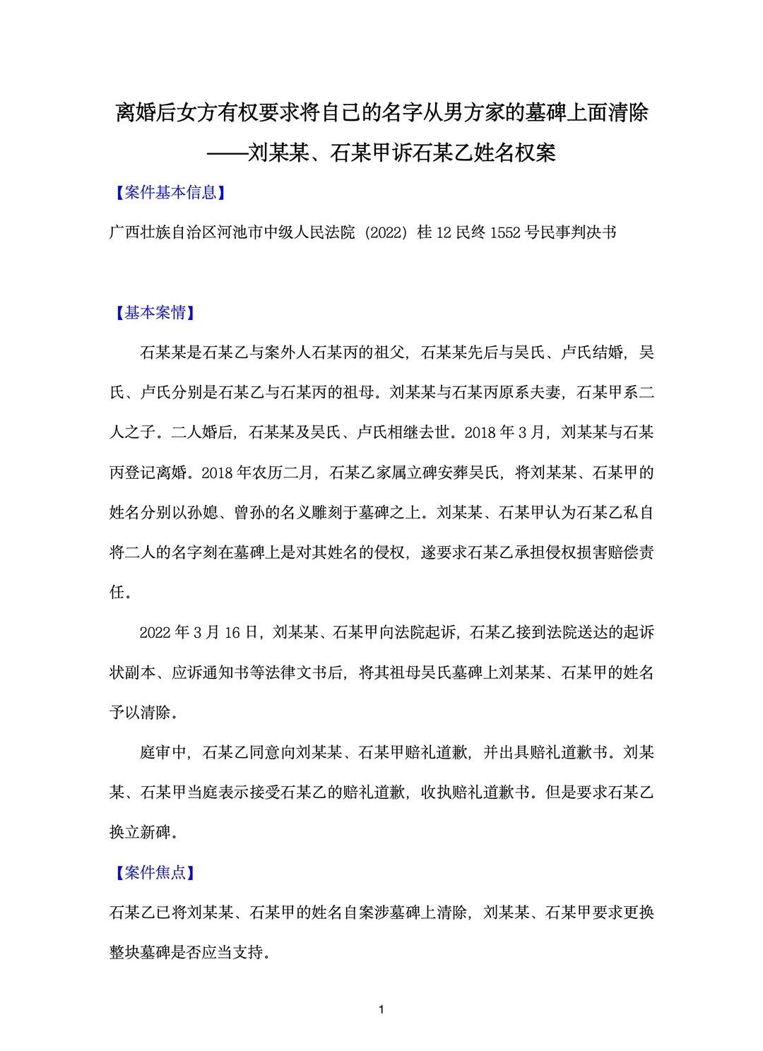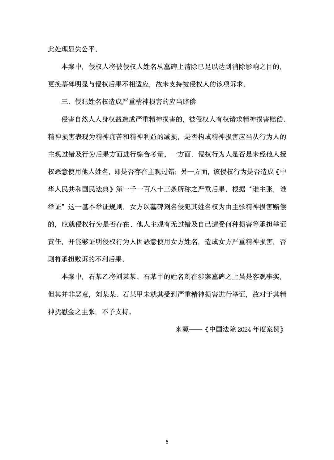 实习律师 | 案例学习打卡第1️⃣6️⃣6️⃣天! 离婚后女方有权要求将自己的名字从男方家的墓碑上面清除 【案由:姓名权纠纷】 要点: [一]墓碑刻名应当尊重公序良俗 关于墓碑刻名是否侵犯女方姓名权的问题。法院裁判时,应当分两种情况处理:1️⃣是如果立碑刻名发生在当事人婚姻关系存续期间,双方存在亲属关系,女方对刻碑事宜知情并不表示反对,则不侵犯其姓名权,即使离婚,女方亦不能以侵犯其姓名权为由,要求将其姓名从墓碑上清除。2️⃣是如果立碑刻名发生在当事人离婚后,双方亲属关系解除,男方或其家人未经女方同意,在自家墓碑上篆刻女方姓名的,则构成姓名权侵权。 [二]侵犯姓名权的责任承担亦应与侵权后果相适应 侵权责任的立法本意,旨在弥补当事人的损失,侵权责任的承担与侵权后果相适应,这是侵权责任的应然之义。除以金钱支付为履行方式的损害赔偿责任应当以填补损害为原则外,其他的侵权责任承担方式也应当注意侵权责任的适度性。 [三]侵犯姓名权造成严重精神损害的应当赔偿 侵害自然人人身权益造成严重精神损害的,被侵权人有权请求精神损害赔偿。精神损害表现为精神痛苦和精神利益的减损,是否构成精神损害应当从行为人的主观过错及行为后果方面进行综合考量。一方面,侵权行为人是否是未经他人授权恶意使用他人姓名,即是否存在主观过错;另一方面,该侵权行为是否造成《民法典》第一千一百八十三条所称之严重后果。根据“谁主张,谁举证”这一基本举证规则,应就侵权行为是否存在、他人主观有无过错及自己遭受何种损害等承担举证责任。 法考 案例分析 实习律师 法律实务 自律打卡 打卡学习 每日一个法律小知识 法律人 法学生
