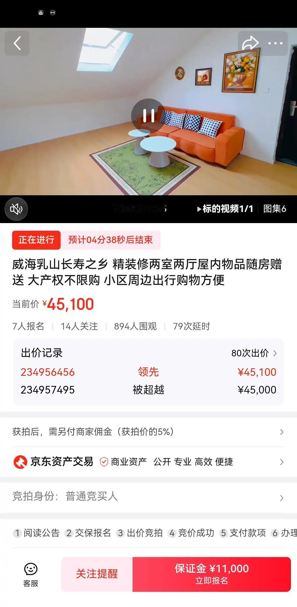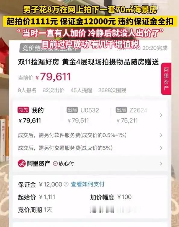 男子花8万元网购70 平海景房:目前过户成功? 我去看了,全是1000左右的起拍价,这不正拍着呢,不用担心,拍的人多了就有邻居了,想捡漏去找法拍房,这种就是以前买了投资度假,现在保值卖房的。
