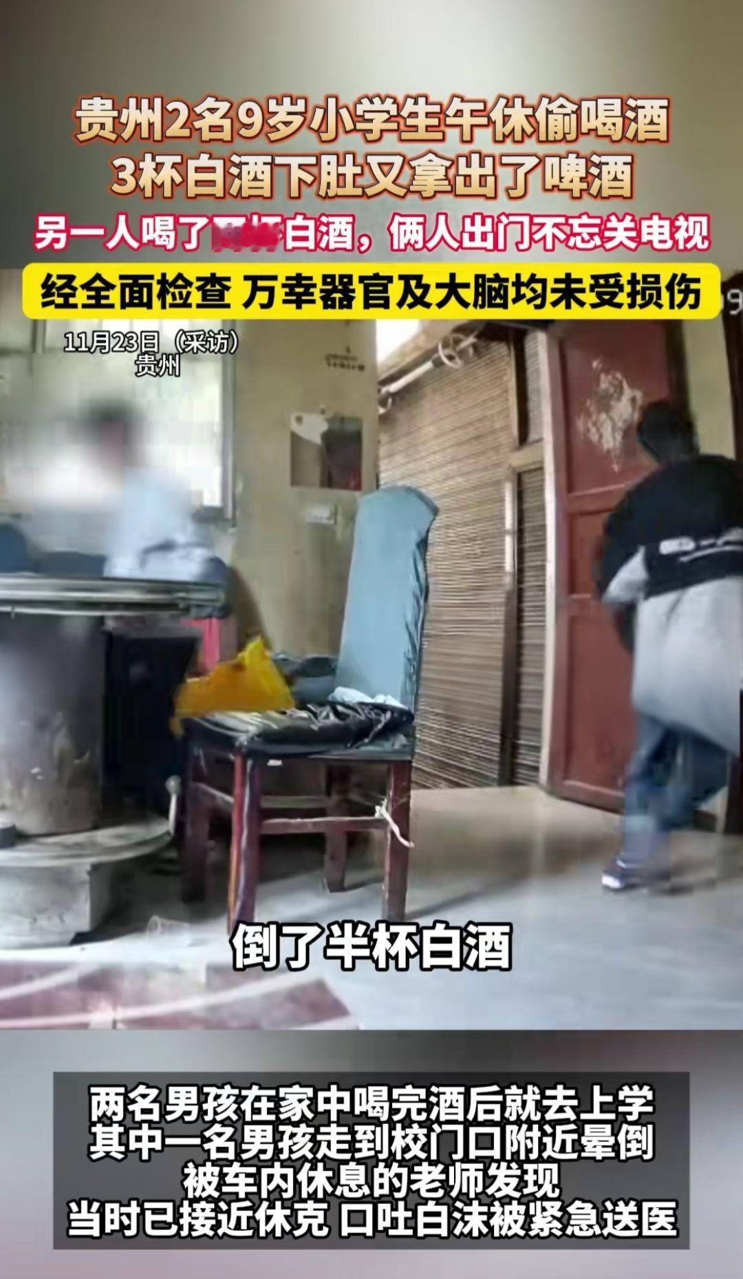 贵州2名9岁小学生午休偷喝酒,3杯白酒下肚又拿出了啤酒,另一人喝了两杯白酒,俩人出门不忘关电视,经全面检查 万幸器官及大脑均未受损伤