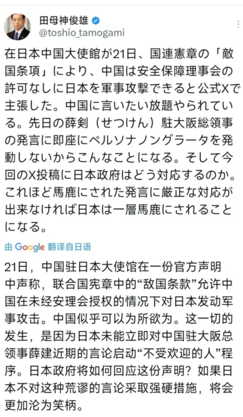 中国引述《联合国宪章》的“敌国条款”,如果日本等二战战败国有侵略行动,五常国家可以不经过安理会授权就可以直接读对这些二战战败国采取军事行动。11月23日,日本前航空幕僚长田母神俊雄出来叫嚣,日本政府应该对中国方面的言论采取更加强硬的措施。