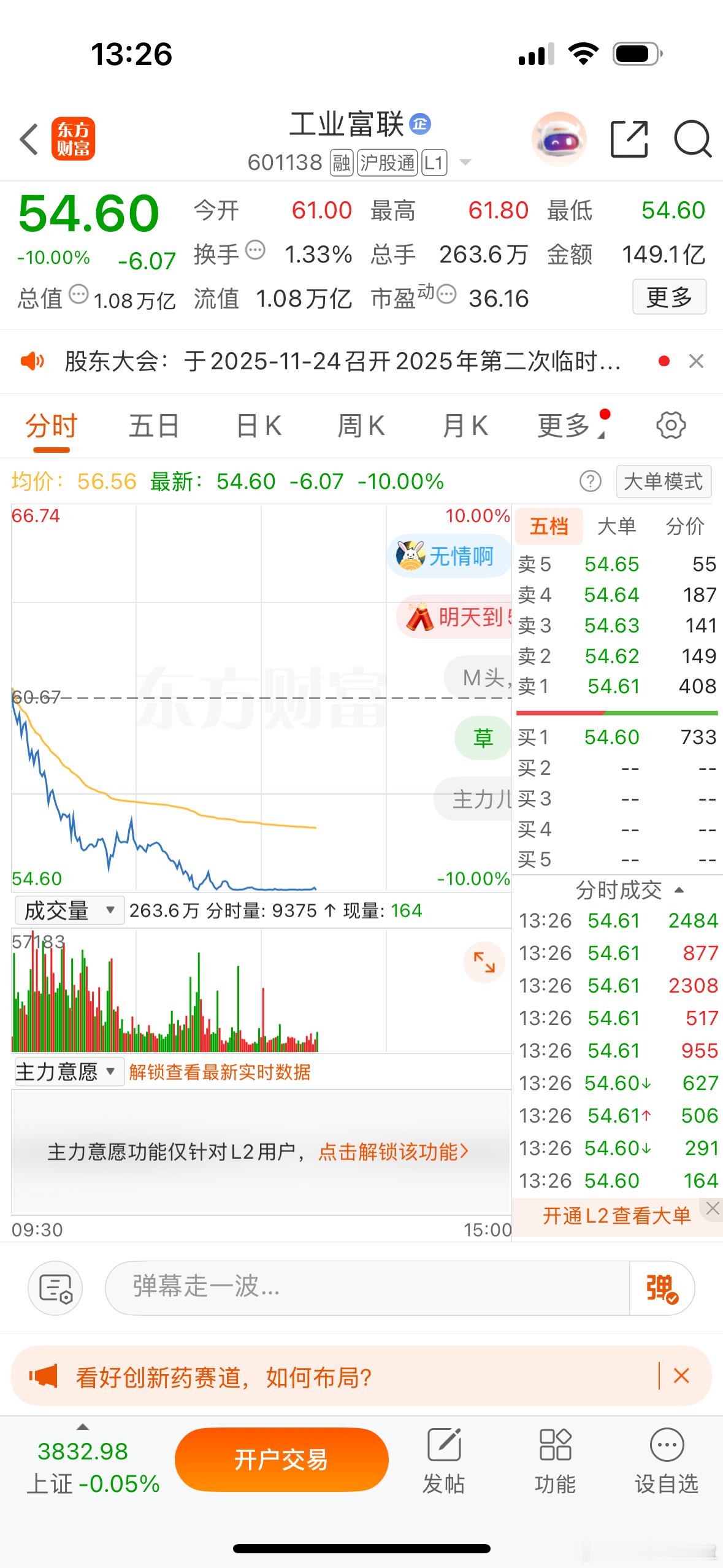 工业富联跌停……各大机构抱团取暖高位票,一旦内部意见不统一,就会瓦解土崩然后出现踩踏。从10多元涨上来,最高80多,各大主力机构赚得盆满钵满。高价股涨起来快,跌起来更快。下跌趋势中,千万不要去接飞刀,那怕40块钱卖给你,主力也照样赚钱,因为它们的成本很低很低。卖出去就是赚钱,然后再把股价打到更低的价格,让散户受不了了就割肉,散户一边割肉主力一边收集筹码,等待下一个轮回。