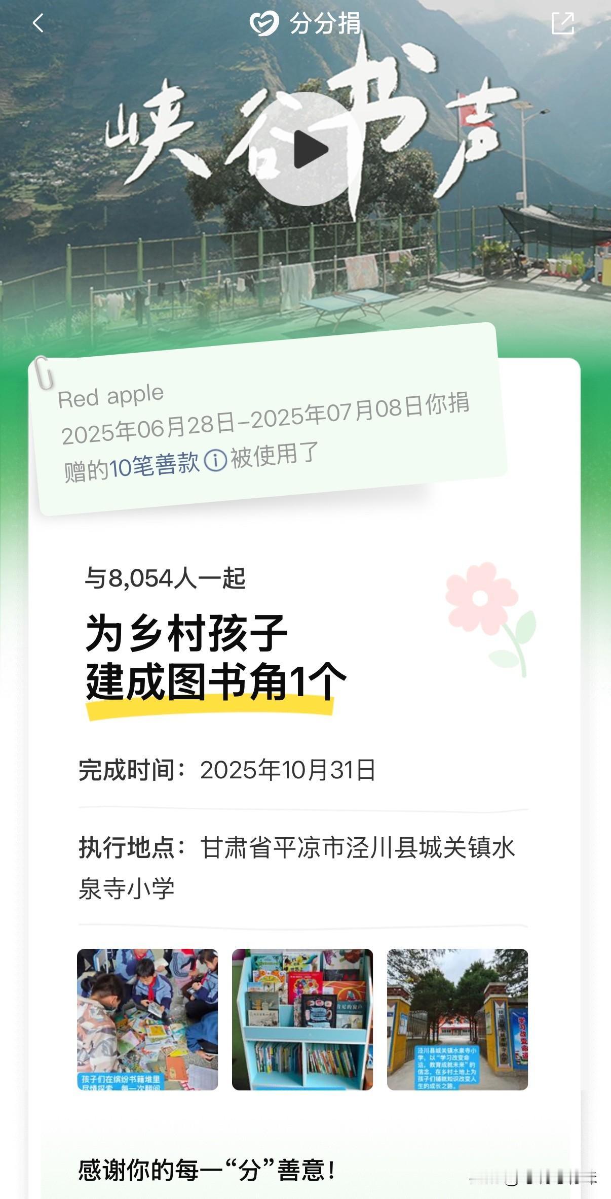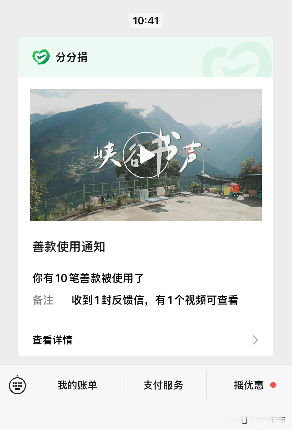 今天最开心的事情就是收到了善款被使用的通知📢 开通了付款自动捐赠已经好几个月的时间了,第一次收到款项被使用的通知,捐的不多、每次付款都会自动捐赠一分钱。 这个公益组织真的是非常用心,这些孩子们开心的表情看了让人心情愉悦。 这次是和几千位捐赠者一起建设了这个图书角,这个社会就是太需要关怀和爱❤️了,尽自己的一点绵薄之力能够帮助到有需要的人会很开心,同样我也是这样被其他人帮助。 我把捐赠看作是一种分享,一种能力之内的分享,使双方愉悦。 我想起哈佛大学校长的2022届毕业典礼演讲:为别人留个位置,我们要做的能做的还很多。 这个迫切需要改善的环境,需要更多的爱来传递,来唤醒人们内心的良知,爱身边的人爱自己,一起变得更好。[太阳] 公益 乡村 儿童