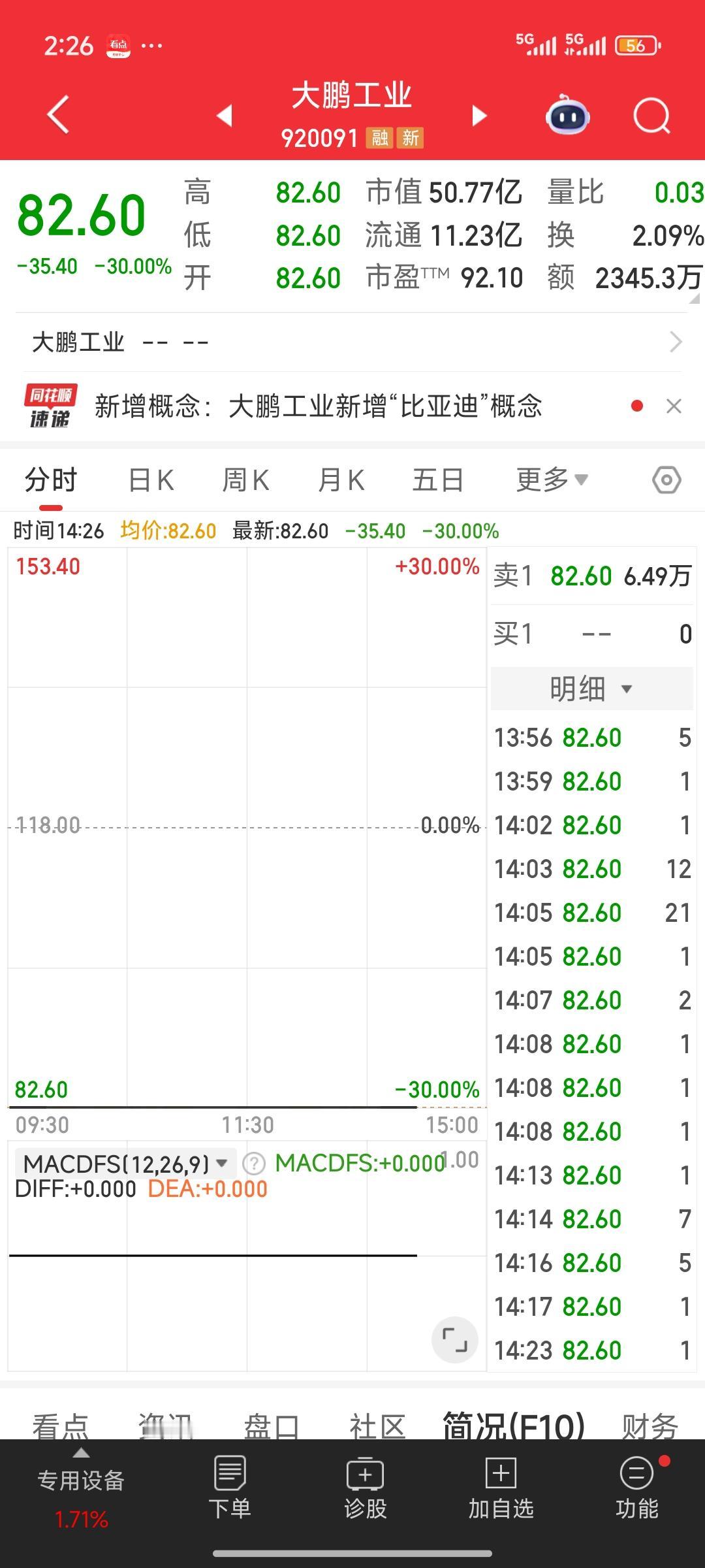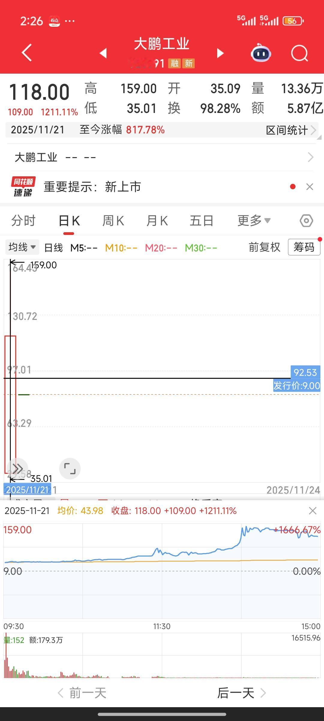 冲动是魔鬼,冲动是魔鬼。 上周五,大鹏工业这只新股上市,开盘便大幅上涨。在最后的一个小时里,股价更是暴涨,接近15倍。要是有人在最后一小时追涨买入,今天可就吃了大亏,一天就下跌了30%,估计明天还会再跌30%,直接腰斩,这就是活生生的例子。 由此可见,炒作新股风险巨大,我们要远离新股炒作。同时,要克制冲动,别看到股价涨得很高,就头脑发热、不管不顾地追高买入。否则,结局必定惨不忍睹。 大鹏 湖北大鹏 大鹏有限公司 大鹏农机 常熟大鹏科技 大鹏金融 郑州大鹏商贸
