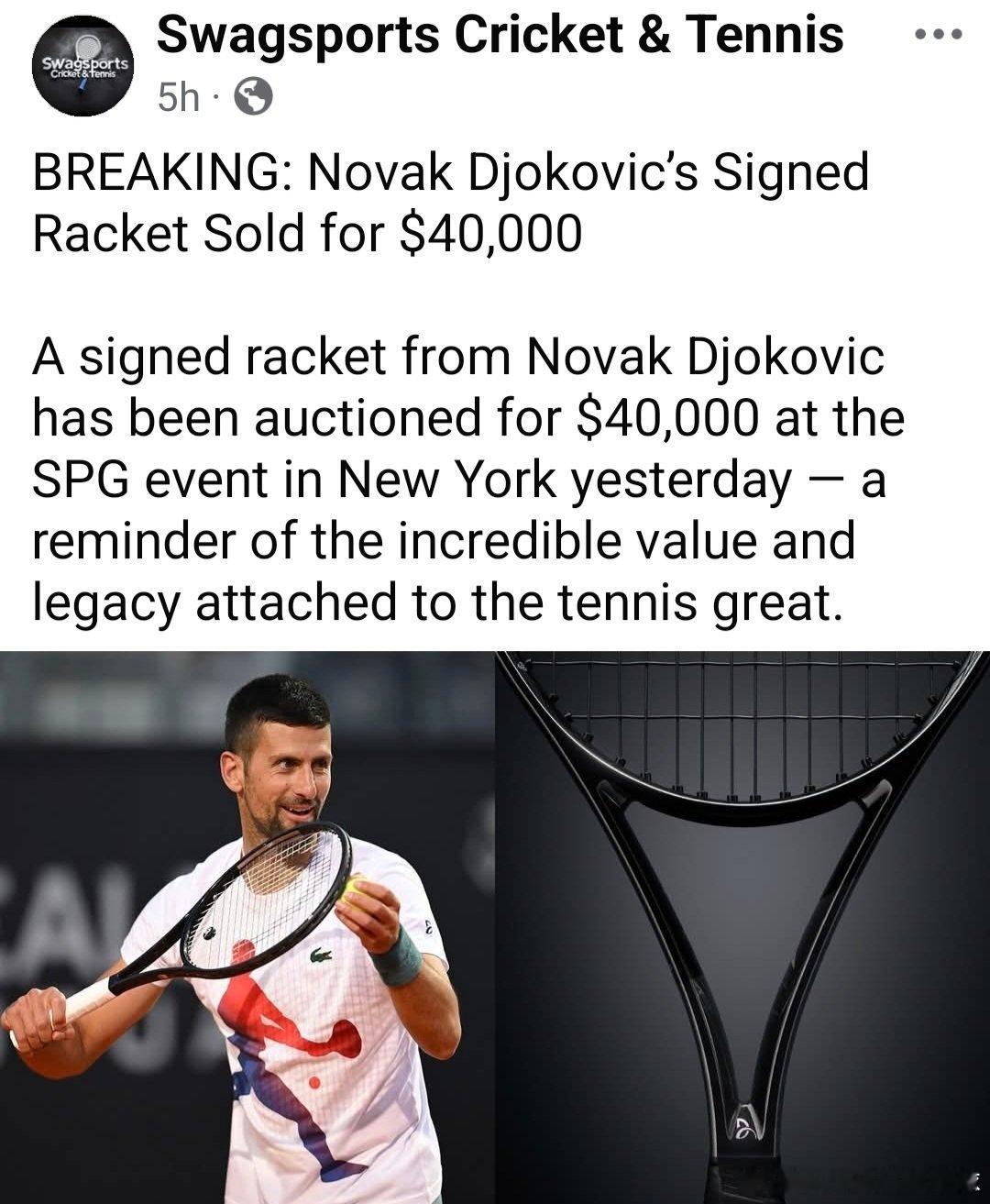 网球巨星的价值!一条突发新闻:德约科维奇签名球拍以40,000美元的价格出售昨天