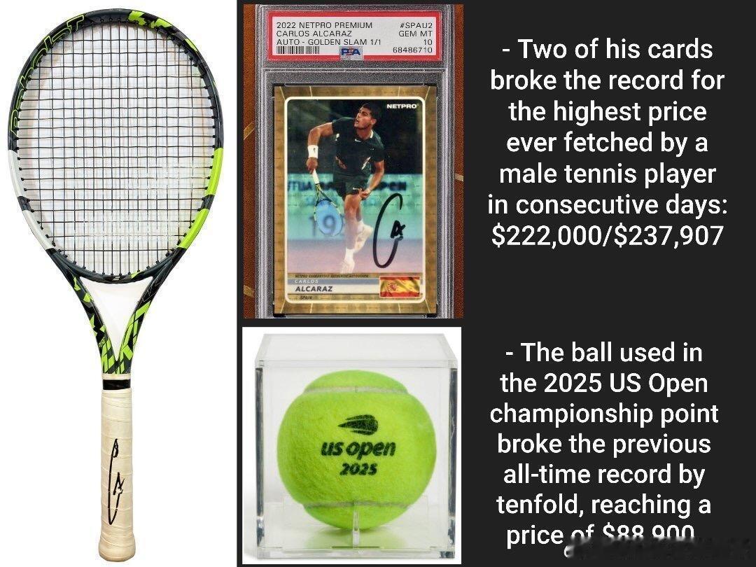 网球巨星的价值!一条突发新闻:德约科维奇签名球拍以40,000美元的价格出售昨天在纽约举行的SPG活动——提醒了这位伟大的网球运动员所具有令人难以置信的价值和遗产。这只是德约的一只普通的签名球拍,就拍到了这么高的价格,再看看其他球员的:纳达尔2017年法网夺冠球拍创下的157,000(137969欧) 美元的当时拍卖纪录!阿尔卡拉斯在2023年温布尔登网球公开赛决赛中使用的一支球拍则打破了纳达尔的记录达到173,066美元。另外,他的两张网球卡的售价分别为 222,000 美元和 237,907 美元,也是新的记录而今年美网冠军点的比赛用球则打破了以往的纪录,以高于纪录10倍的价格成交,达到 88,900 美元!这就是巨星的价值!