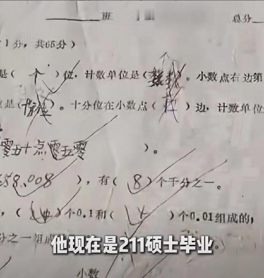 不要焦虑孩子成绩!11月23日,广东一女生收拾东西时发现哥哥小时候考57.5分的试卷,而如今哥哥已经是211硕士毕业! 现在不仅成年人的工作压力大,孩子的学习压力也大。当家长看到孩子57.5分的试卷,可能会感觉孩子是个学渣,一辈子也就这样了,可是事实真的是如此吗? 广东这位女生翻出的是哥哥1999年的数学试卷,老师红笔画了大大的57.5分,哥哥还自己用笔改成了58.5分。哈哈,妥妥的小孩子心态啊! 女生回想哥哥小时候,经常因为学习差而被父母追着打,父母也几度以为儿子就是个学渣,不是读书的料! 可是任谁也没想到,哥哥如今竟然是211硕士毕业,妥妥的高材生。 因此,女生特意借此奉劝各位望子成龙、望女成凤的家长,不要觉得孩子当下成绩不好就否定孩子,说不定孩子就属于厚积薄发的那种,最后能够一鸣惊人呢? 与其盯着孩子的分数发飙,不如帮助孩子稳扎稳打,养成良好的学习习惯。孩子在求学道路上距离父母越来越远,唯有养成良好的学习习惯,才能帮助孩子在未来负重前行的路上稳步前进! 孩子学习