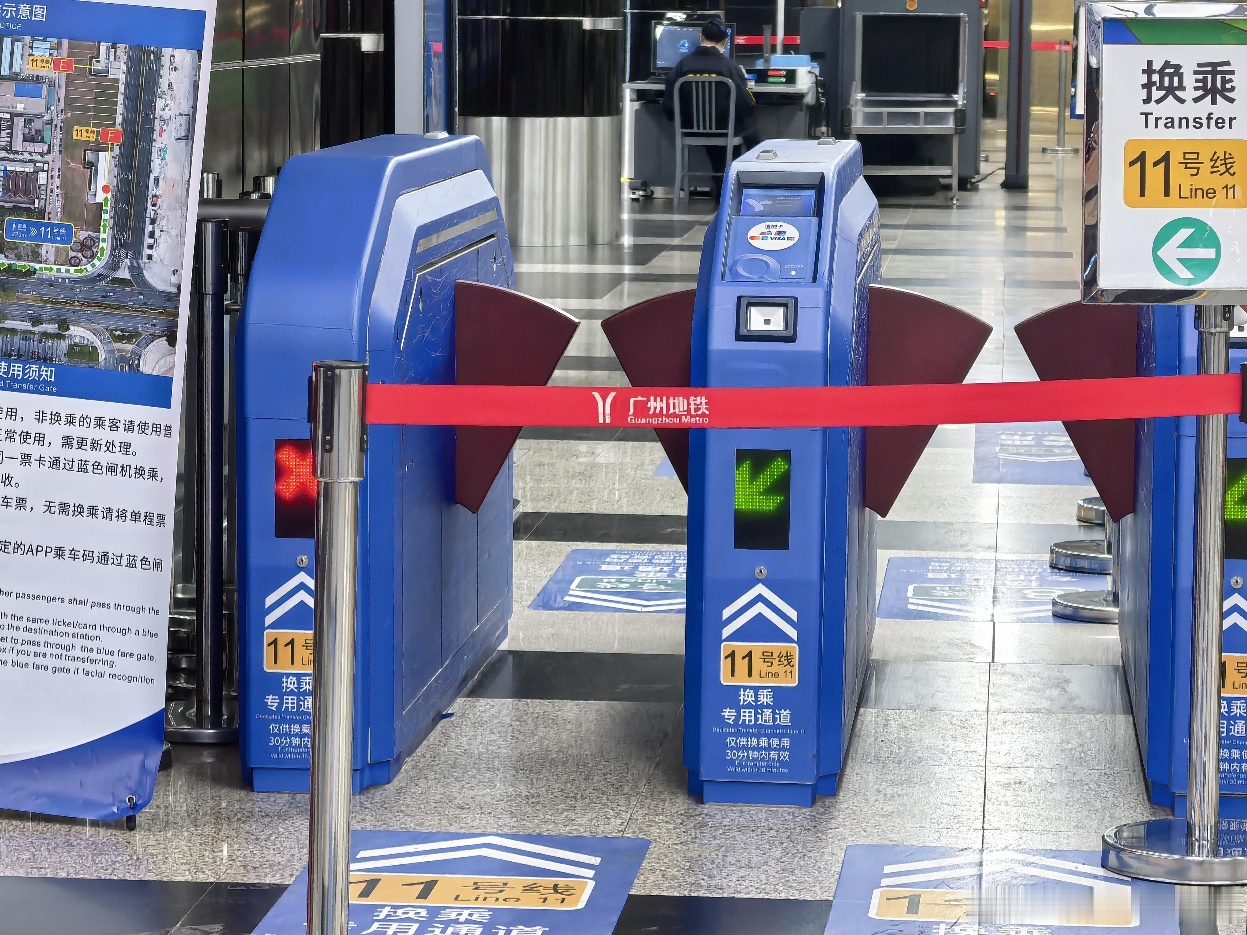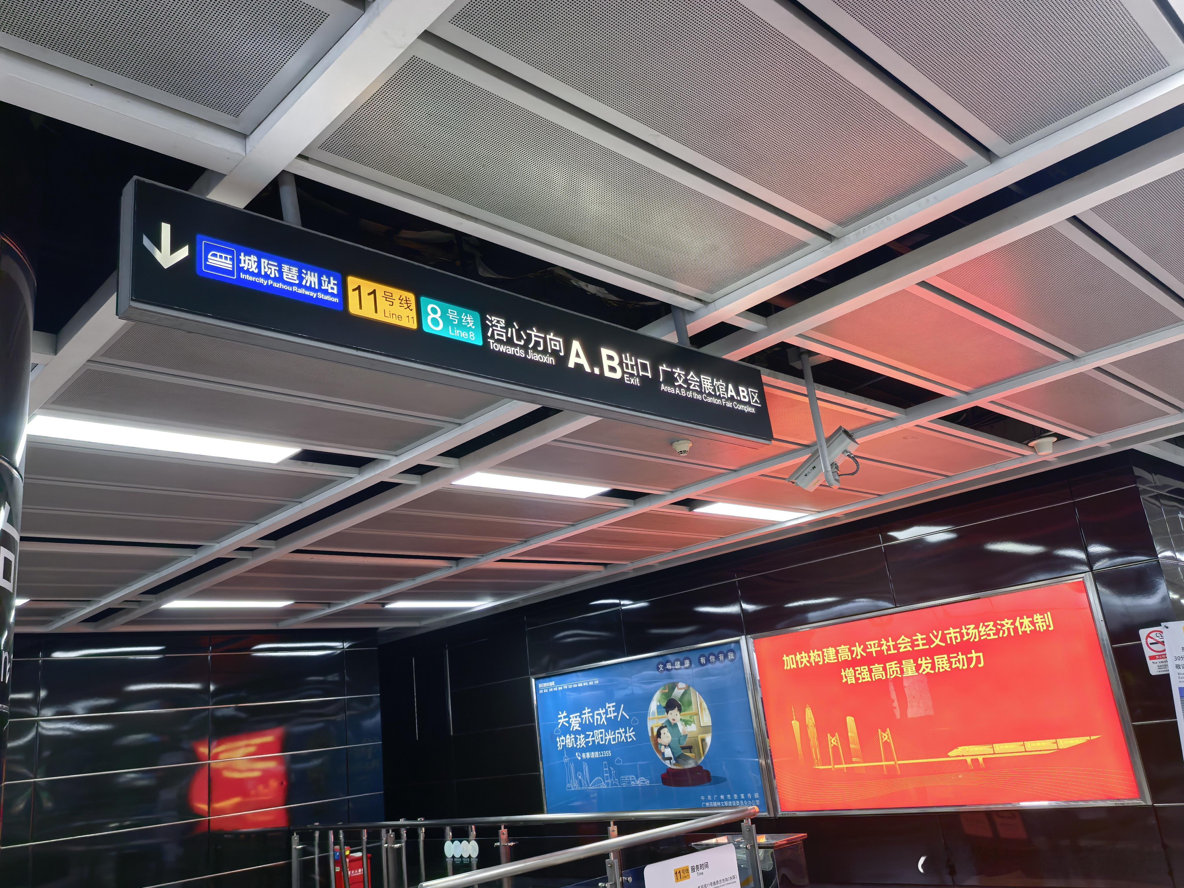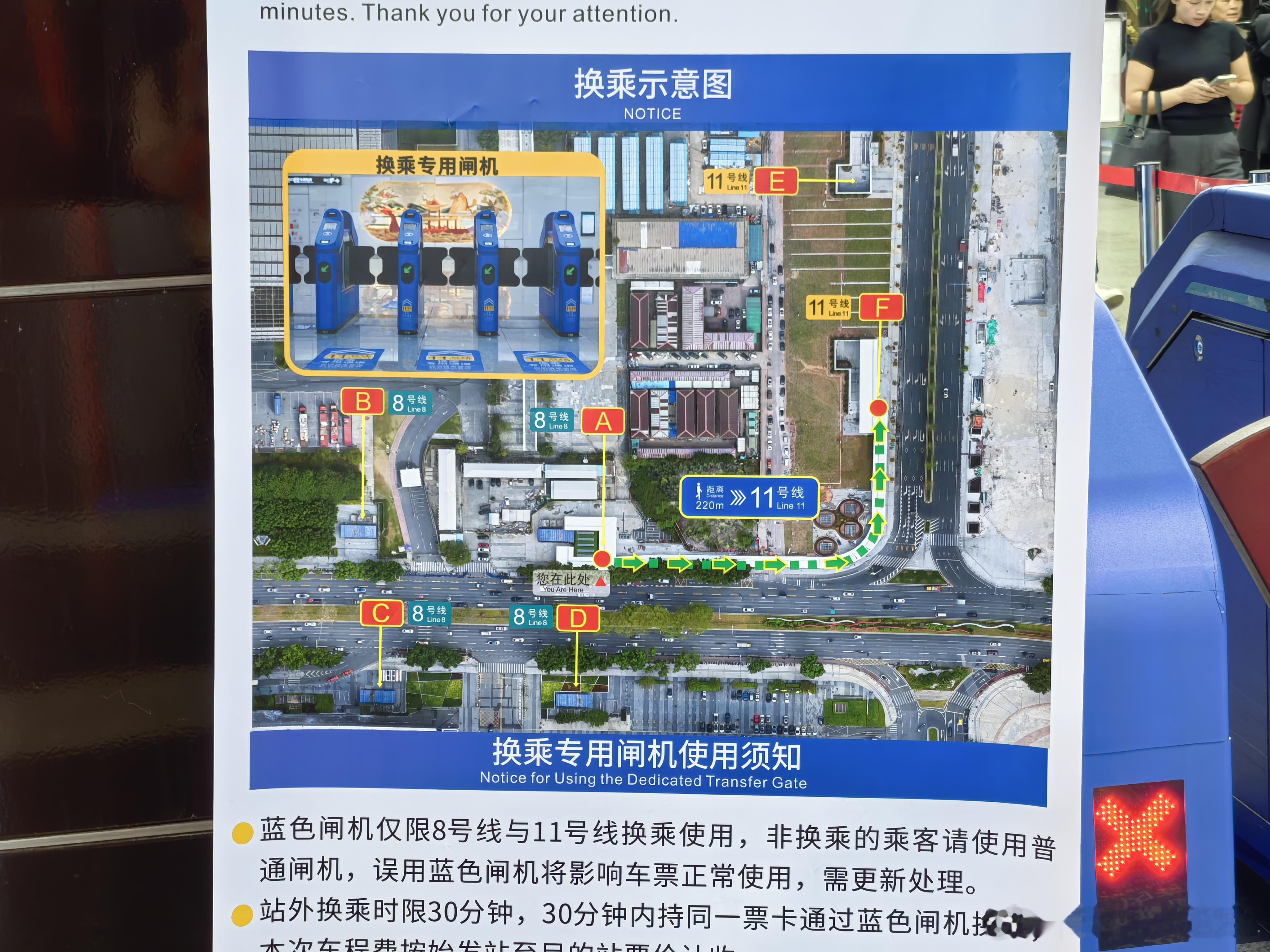 因为广州车展,第一次见到8号线琶洲站这个独特的换乘站,有各种提醒注意事项,看着好吓人。最简便的方式或许就是让用户在本站出站,然后去11号线的琶洲站再进站。