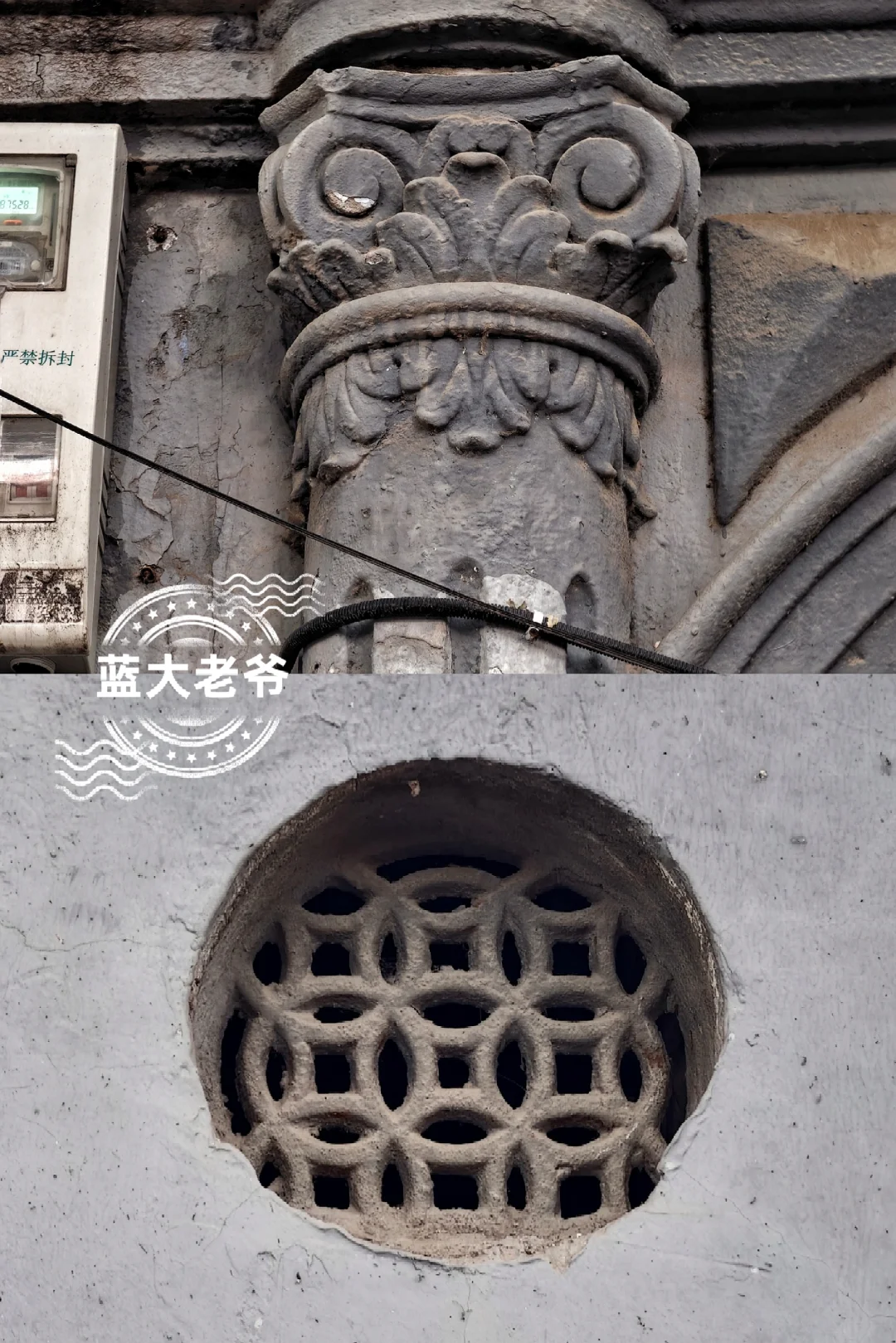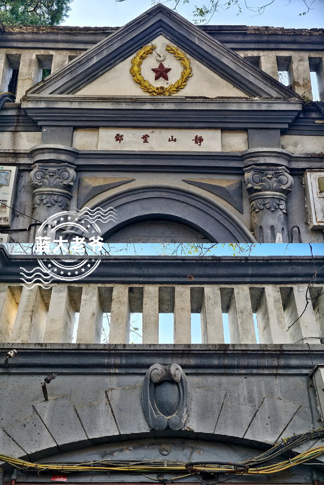 🌅静山堂南北一排二门八窗,十全十美,大门典型民国西洋风格,南门为正门,爱奥尼门柱,顶部围栏,三角山花,半圆券门,悬石匾静山堂郑,北门无立柱,有饰章,南门山花图案红星麦穗,红星建国后改的,跟民国五角星不一样,院门朝东,院内为五套南北向一进合院,以月亮门相连,屋高三米余,北门宅地下有酒窖,南门围栏上有二层天棚,60年代被拆除,房屋下水管道皆铁制埋入墙体内。