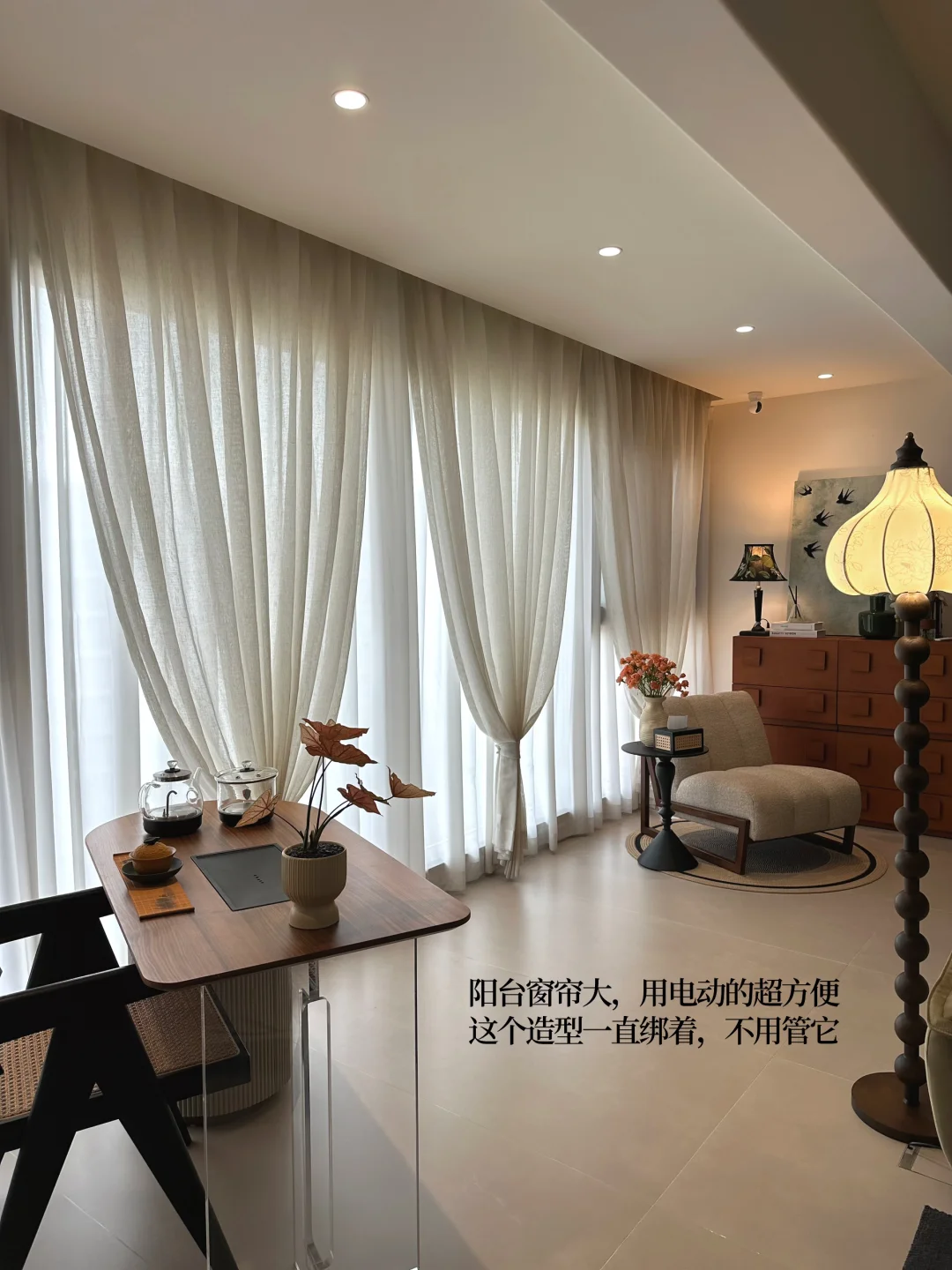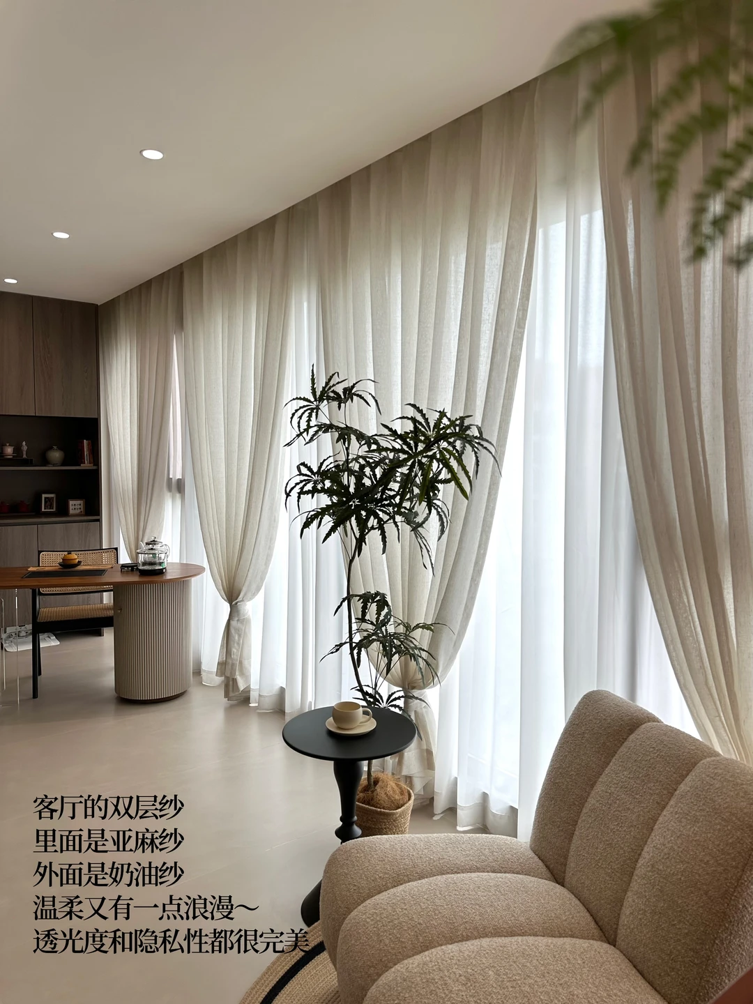 客厅选的双层纱,阳光透进来时光线柔和,微风吹过时轻盈飘逸,白天根本不需要开灯,整个家都通透温馨。