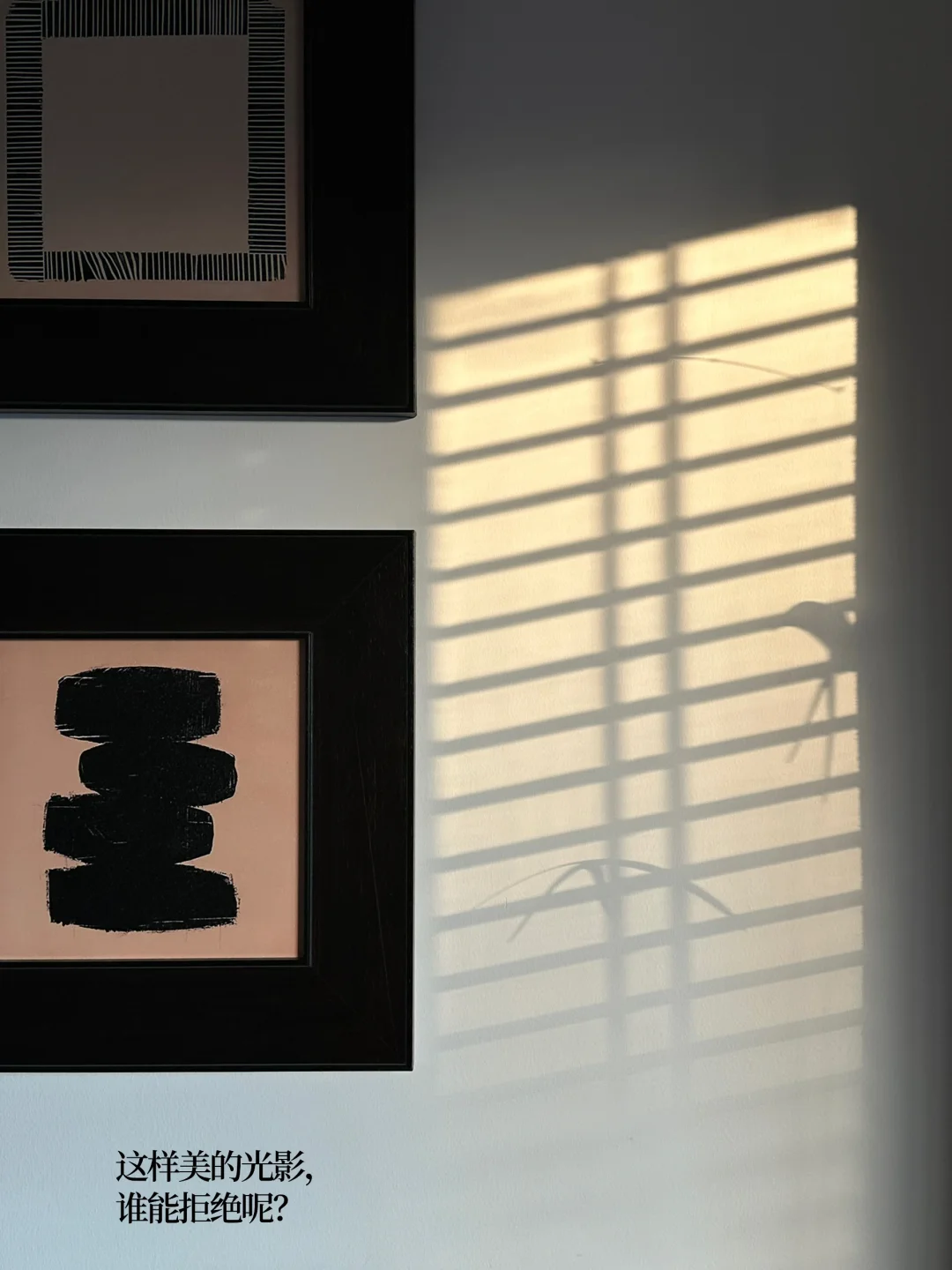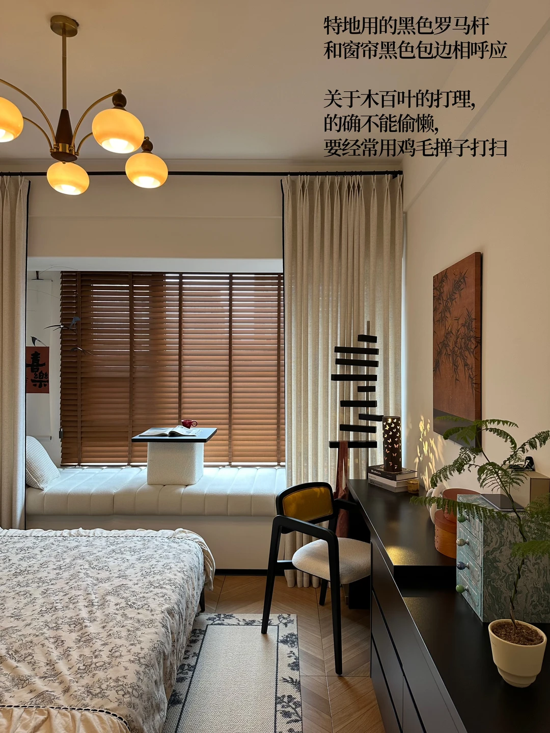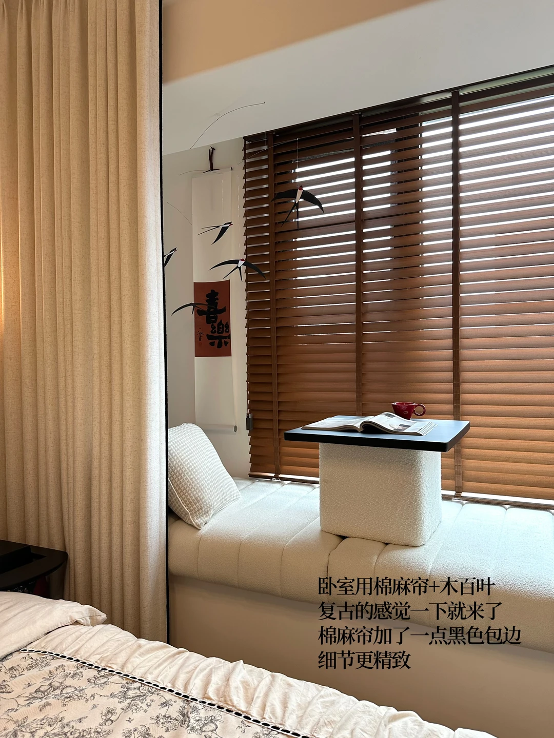 卧室搭配了棉麻帘+木百叶。棉麻质感满分,木百叶则轻松调节光线,清晨洒进来的光影特别治愈。要注意的是这样的搭配全拉上的遮光效果是80%,不太适合有全遮光要求的姐妹。