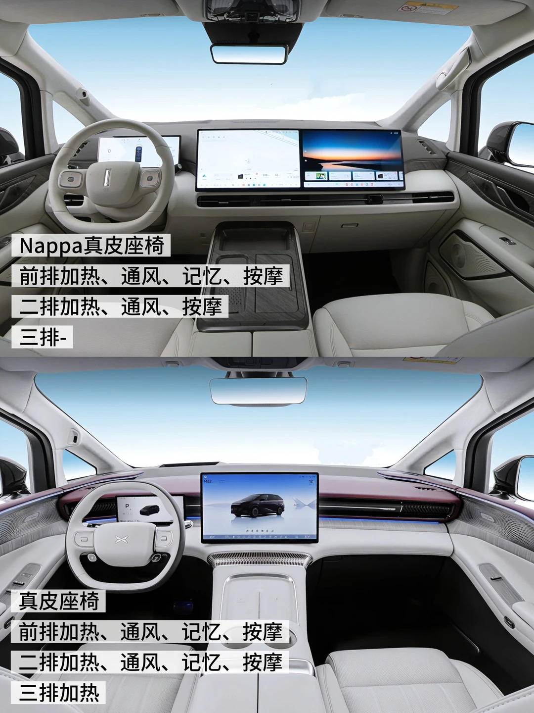 ✔️X9~真皮座椅,前排配有加热、通风、记忆、按摩,二排零重力座椅配有加热、通风、记忆、按摩,三排支持加热 电动调节,支持电动放倒。