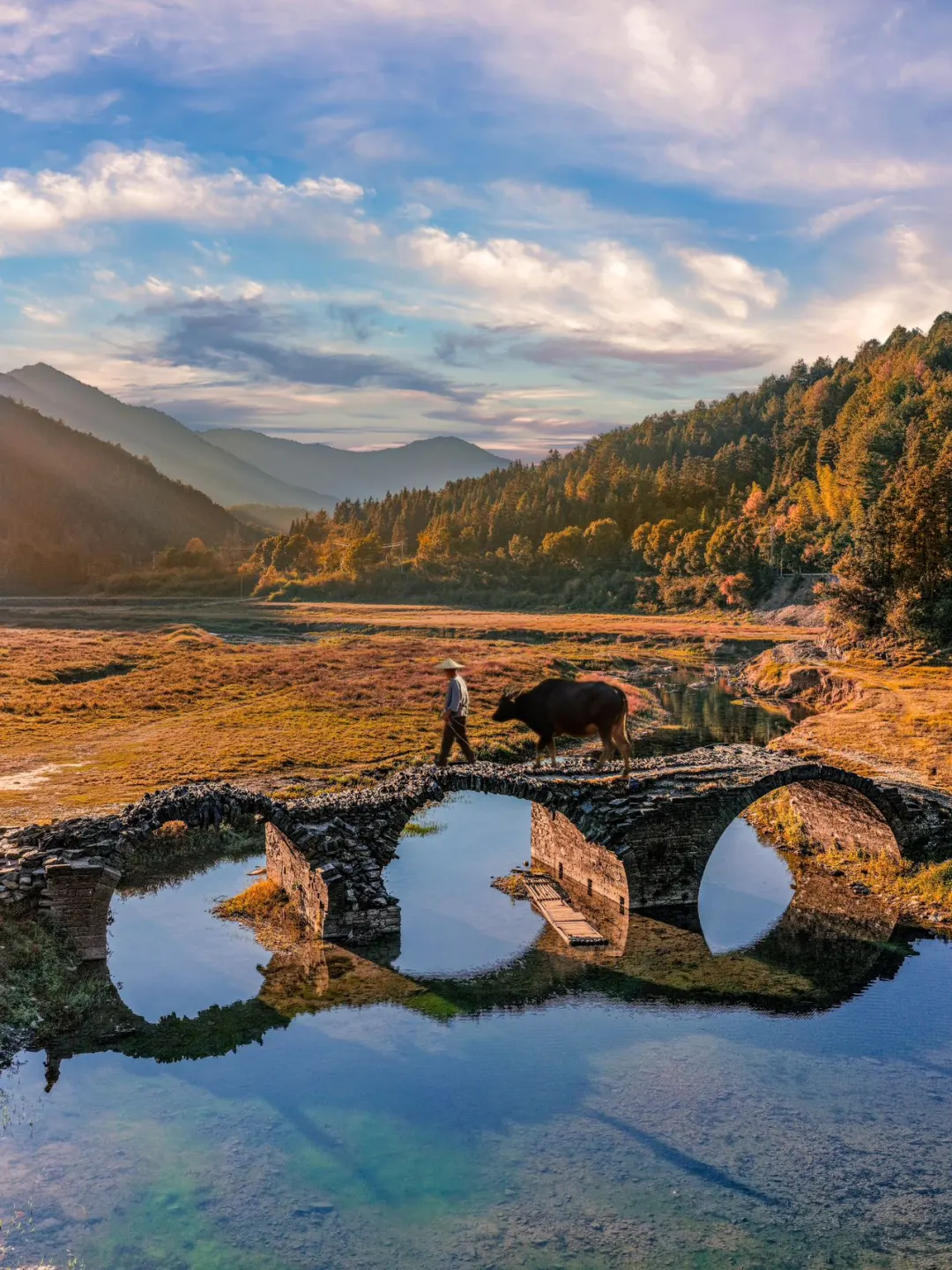 · 傍晚: 抵达 【漳村】,直奔那座经典的“板凳长桥”。日落时分,桥影倒映在水中,牧归的老牛走过,画面治愈到心底。