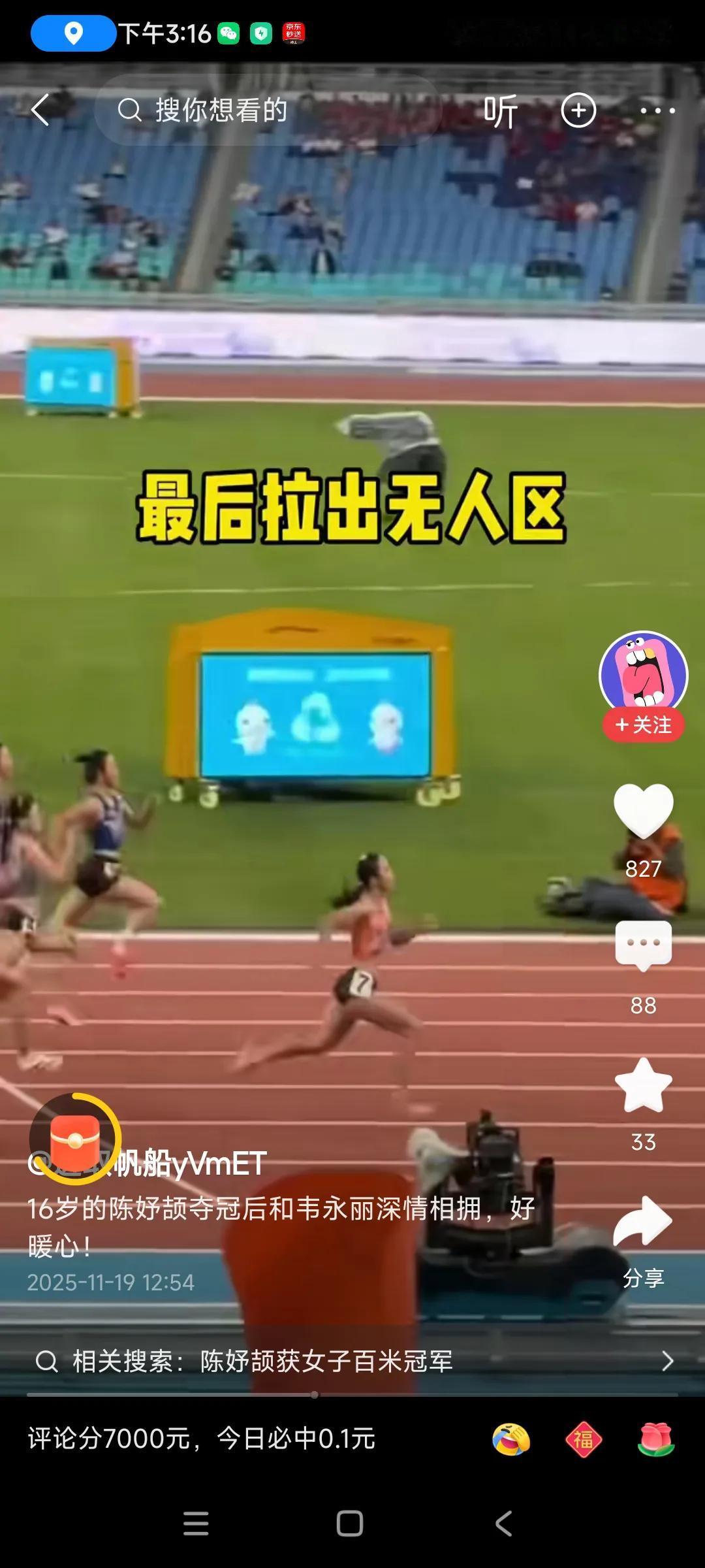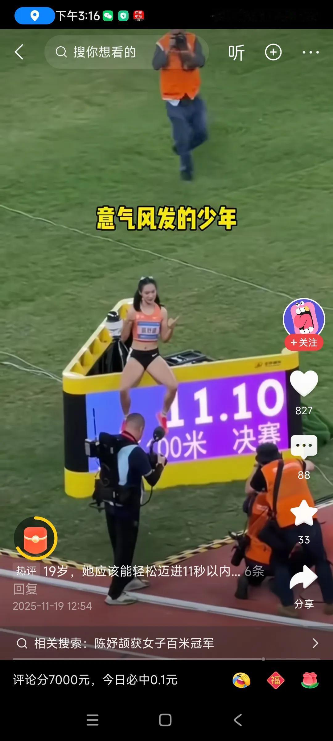 中国田径继刘翔之后,又有一个天才横空出世,16岁夺取全国冠军,而且是热门的100米项目,看了赏心悦目,前途无量啊,,, 她这个项目,比跳水,乒乓球,关注度高很多,只要你保持状态,成绩再提高一点,下届奥运会冲击金牌,机率很大,只要夺下金牌,估计一年广告代言至少50家! 理由有几个, 一,她是08年出生,才16岁,年轻有优势, 二,性格阳光,自信,性格有优势, 三,聪明,反应快,悟性好, 不自不觉中我己老了,时间过得太快了,00后也走上世界舞台,六零后,七零后,逐渐退出历史舞台了,八零后的飞人刘翔已退役好多年了,以后就是九零后,00后的天下了,,,