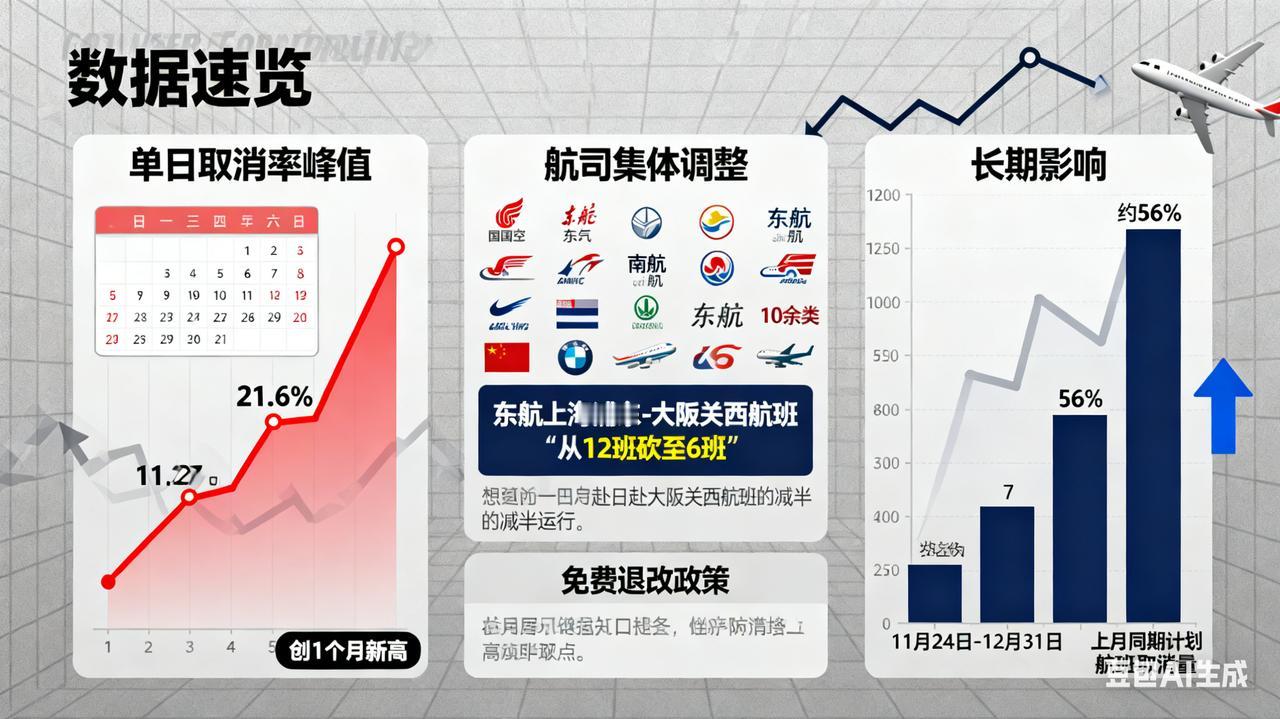 🚨中日航线大调整!12条航线"停摆",赴日航班取消率飙升 12条中日航线取消全部航班中国对日本的最新警告很不一般郑丽文向马英九“借将”有何深意 ① 航线"冷冻"名单 12条中日航线全部取消:截至11月24日10点,包括杭州萧山-中部国际、北京大兴-新千岁、南京禄口-福冈等航线航班归零。 高取消率航线TOP5: 天津滨海-关西国际(65.0%) 南京禄口-关西国际(59.4%) 广州白云-关西国际(31.3%) 上海浦东-关西国际(30.1%) 无锡硕放-关西国际(28.6%)。 ② 数据速览 单日取消率峰值:11月27日赴日航班取消率预计达21.6%,创1个月新高。 航司集体调整:国航、东航、南航等10余家航司推出免费退改政策,部分航线减半运行(如东航上海浦东-大阪关西航班从12班砍至6班)。 长期影响:11月24日至12月31日,中日计划航班取消量较上月同期增长约56%。 ③ 背景与连锁反应 导火索:日本首相高市早苗涉台错误言论引发外交风波,外交部提醒公民近期避免赴日。 旅游业"急冻": 日本酒店业受重创,北海道冬季预订量骤降。 中国游客转向韩国首尔、泰国曼谷等地。 经济冲击:若中国游客持续减少,日本GDP或损失2.2万亿日元(约1011亿元人民币)。 ④ 网友神评 "翻成日语发给日本人看!" "旅行社:往年这时候日本冰雪游卖爆,今年咨询电话静悄悄"。 小编点评:航线取消潮背后,是民间选择与外交态势的双重映射。日本旅游业冬天刚来,而中国游客的行李箱已转向东南亚阳光海滩。这场"航班博弈",你怎么看?👉欢迎关注讨论!