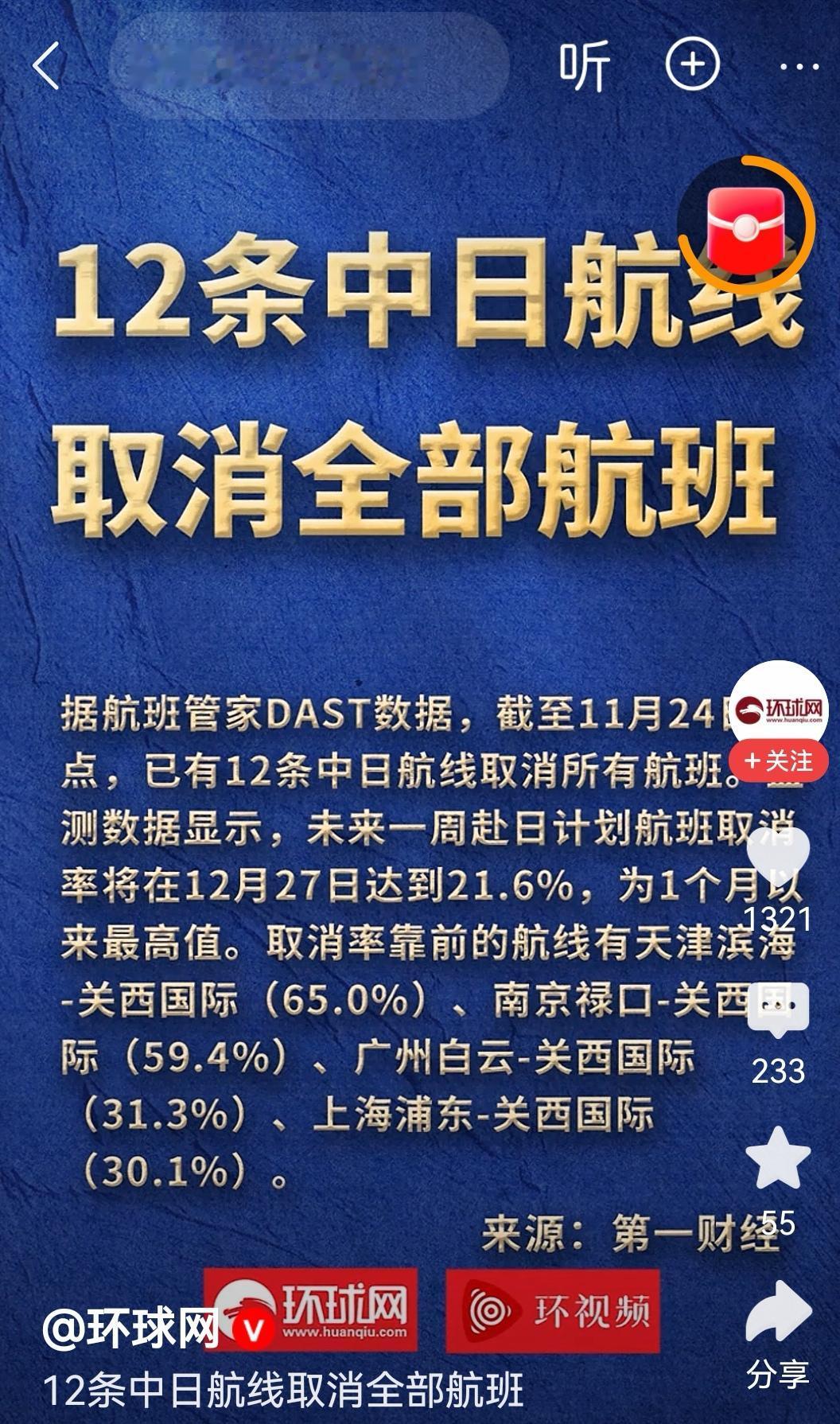 突发!12条中日航线航班全部取消! 第一财经数据显示,截至11月24日,已有12条中日航线取消所有航班。未来一周赴日航班取消率将持续攀升,预计11月27日达到21.6%的月内峰值。其中天津-关西、南京-关西等航线取消率均超50%,上海浦东-关西航线取消率也达30.1%。 如此大规模的航线调整,将对两国商务往来和民众出行产生重大影响。 你的赴日行程受到影响了吗? 中日航线停飞 赴日航班取消