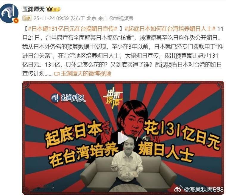 玉渊谭天:起底日本如何在台湾培养媚日人士------【日本砸131亿日元在台搞媚日宣传】 11月21日,台当局宣布全面解禁日本福岛“核食”,赖清德甚至吃日料作秀公开媚日。我从日本外务省的预算数据中发现,至少在3年以前,日本就已经专门拨款用于“推进日台关系”,在台湾地区培养媚日人士,大搞媚日宣传,拨出预算累计超过131亿日元。131亿,具体是怎么花的?又到底买通了谁?戳视频看日本对台湾的媚日宣传计划......