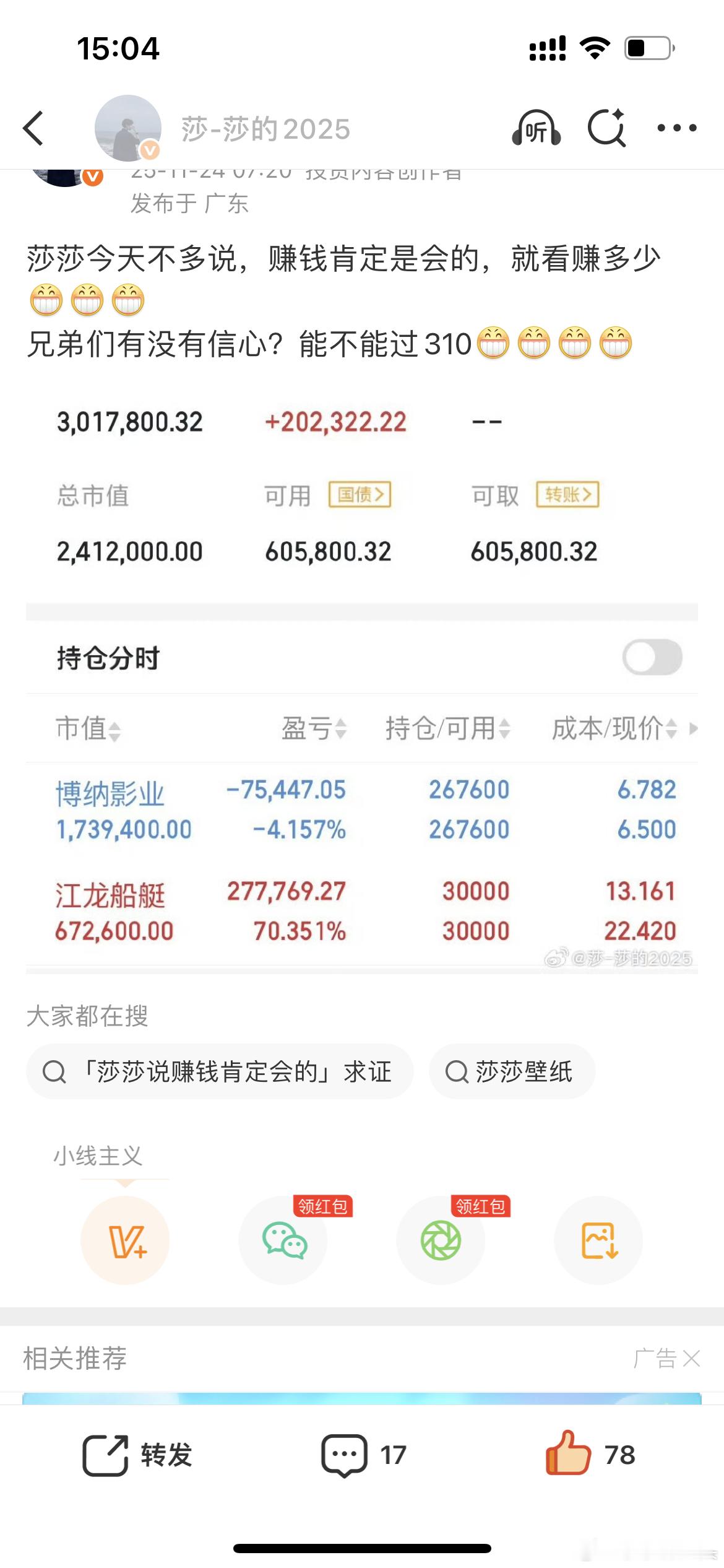 今天早上开盘之前莎莎想着,今天能过310就很开心了,没想到直接过了320这真是大大的意外呀,让我好好惊喜了一翻