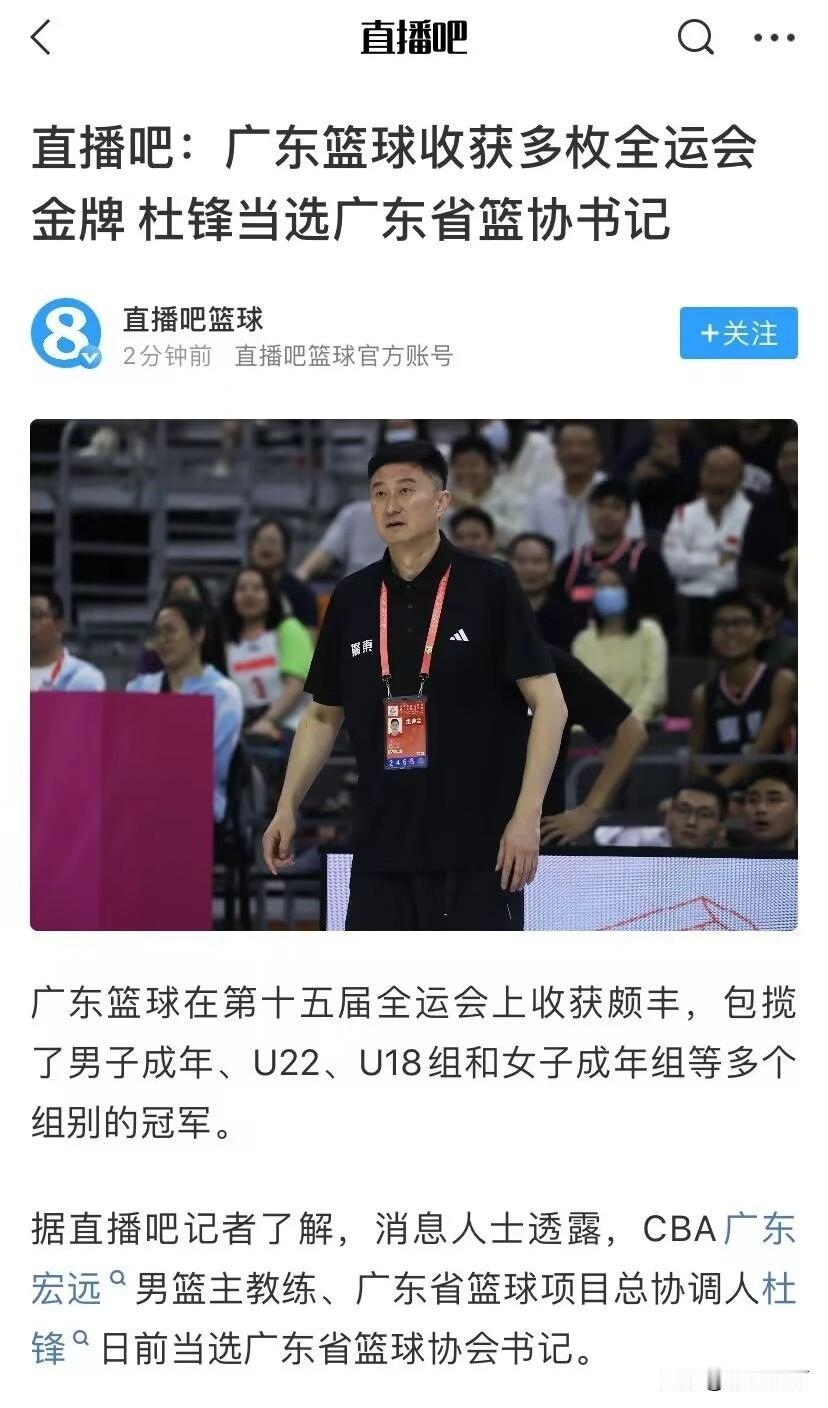 球迷调侃成真,杜锋这是真升职了? 不过原因是因为杜锋是广东篮球项目协调人,而广东队在本届全运会上又收获满满,不仅男篮拿到了成年组、U22组、U18组三个组别三枚金牌。 女篮在成年组也拿到了一枚金牌,U18组别上也有1枚铜牌。 篮球项目拿到4金1铜,这样的壮举恐怕是前无古人,后也无来者,尤其是在国家振兴三大球政策出来后,在篮球项目上再拿到这个成绩,更是含金量满满。 杜锋作为篮球项目负责人之一,带队拿到这样的成绩,升职也在意料之中。