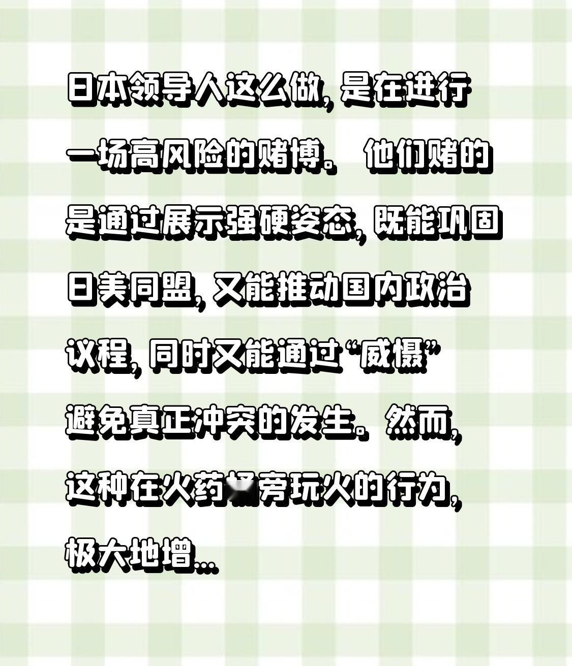 日本领导人这么做,是在进行一场高风险的赌博。 他们赌的是通过展示强硬姿态,既能巩固日美同盟,又能推动国内政治议程,同时又能通过“威慑”避免真正冲突的发生。然而,这种在火药桶旁玩火的行为,极大地增加了战略误判和局势升级的风险,最终很可能将日本带入地狱之中。
