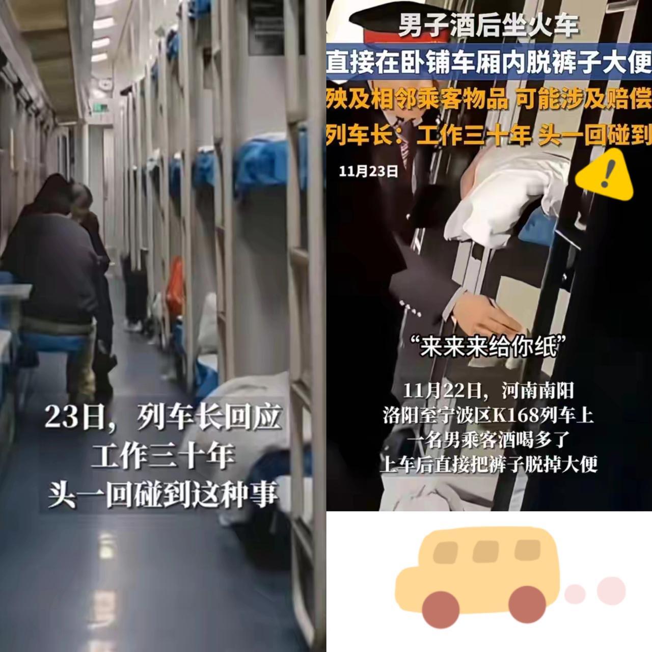 男子酒后卧铺车厢大便, 列车长:三十年第一次遇见这事! 醉酒不是遮羞布,素质低下才是真相! 你想想在密闭的车厢里乱拉,粪便弄脏其他乘客的鞋子和行李箱,隔着屏幕都能闻到臭味。 火车上明明有厕所,走几步就能到,却偏偏选择当众失态,还拿“喝醉了”去当借口。 醉酒顶多让人失控,绝不会让人丢掉做人的底线。连猫狗都知道找指定地方排泄,一个成年人却活得毫无分寸,这根本不是酒后误事,而是骨子里的素质缺失。 公共空间是大家的,不是某个人的“随心所欲之地”。这种行为不仅恶心人,还严重影响公共秩序,光赔偿远远不够。小伙地铁拉屎 火车厕所