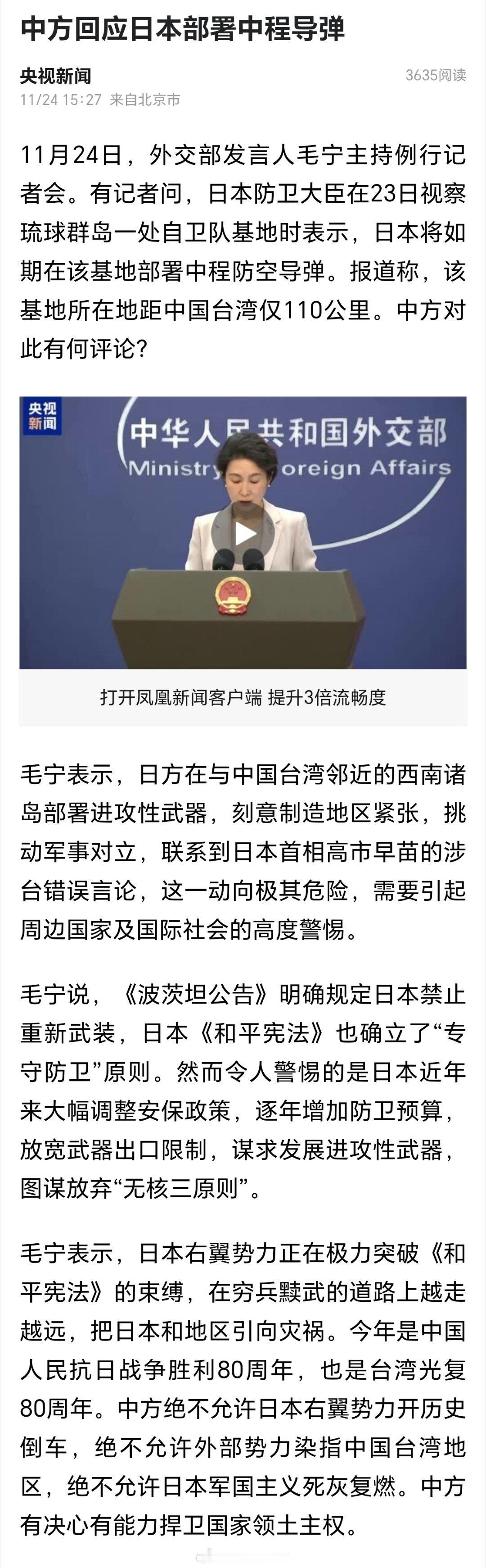 毛宁表示,日方在与中国台湾邻近的西南诸岛部署进攻性武器,刻意制造地区紧张,挑动军事对立,联系到日本首相高市早苗的涉台错误言论,这一动向极其危险,需要引起周边国家及国际社会的高度警惕。