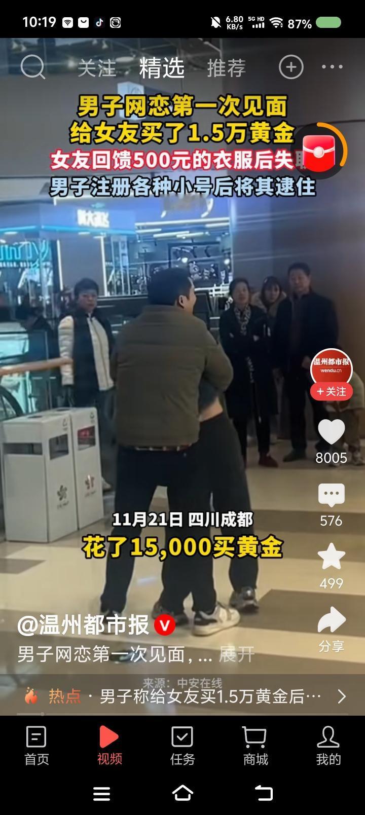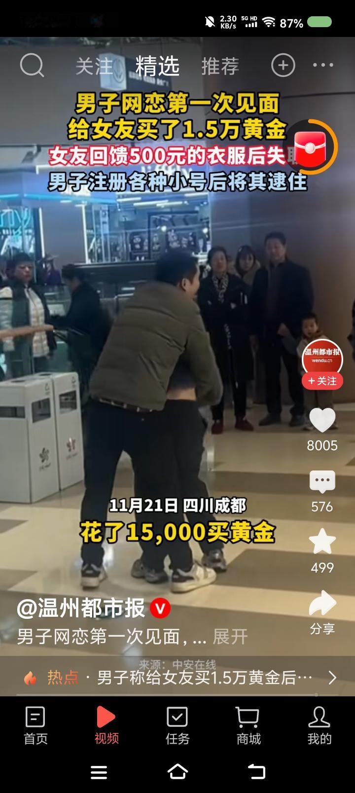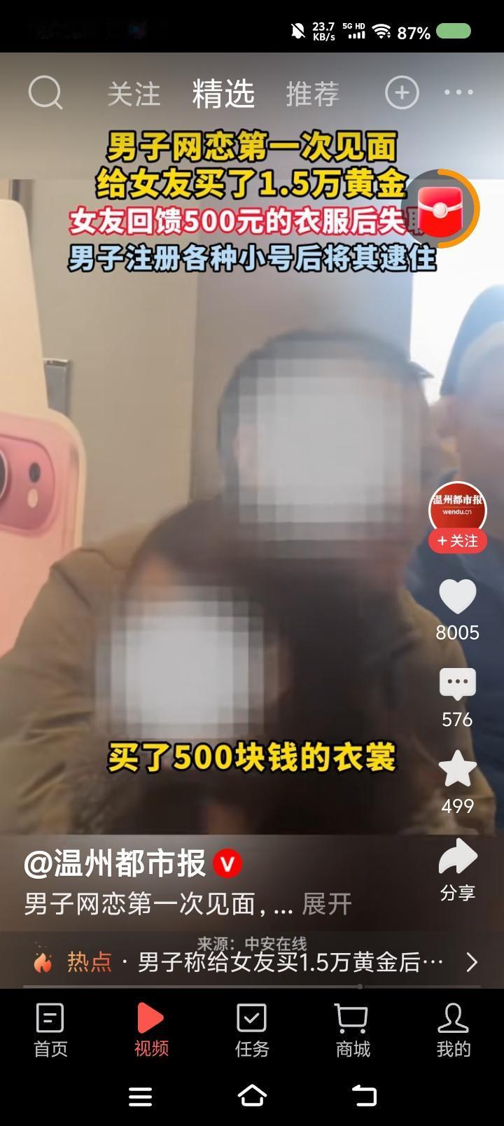 这算恋爱吗?—— 据报道,男子网恋奔现,给女友买了一万多元的黄金,女子反馈500元的衣服。后来,女子失联。男子注册小号找到她,双方产生纠纷。 点评: “我没给你买吗?” “就买了500元的衣服。” …… 我想起电视剧台词:“哈哈哈哈哈哈……” 核心问题只有一个:双方当时以什么动机交往?是恋爱吗?如果是,为什么一方失联?准备恋爱?那见面礼也有点大。 不管怎么说,单就失联这一项,女子行为不当。如果不同意,返还礼物,和平分手。如果对方纠缠,报警!!! 还是我发现的“爱情三大定律”起作用: 爱情只有一次,至多。 ……