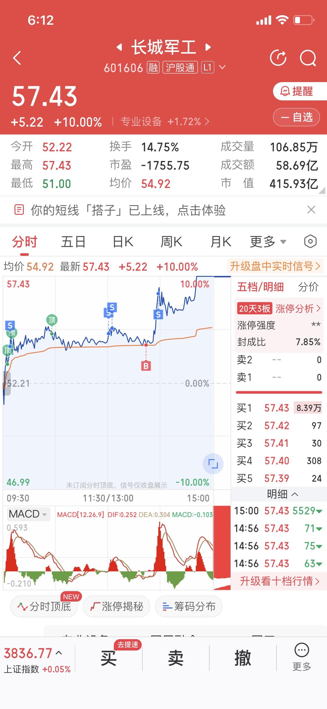 11月24日军工板块持续拉升,长城军工这只票我操作得那叫一个糟心。我瞅着它涨势不错,分别在涨3个点、5个点、6个点和8个点的时候各卖了200股。想着等它回撤再低价接回来,在回撤4个点的时候我回购了200股,还盼着它接着跌。谁能想到啊,它直接涨停了!我就这么眼睁睁地卖飞了。当天10点18分,它涨幅达5%,报价54.85元,成交22.83亿元。这一波操作真是肠子都悔青了,以后还是得调整策略,不能这么盲目操作了。