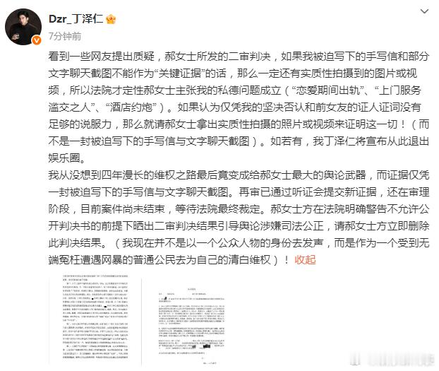 刚刚,丁泽仁再发文,喊话“唯一的姐”:“郝女士方在法院明确警告不允许公开判决书的前提下晒出二审判决结果引导舆论涉嫌司法公正,请郝女士方立即删除此判决结果。”