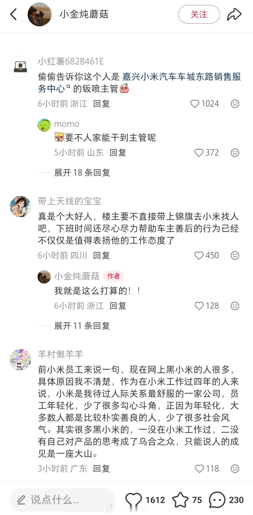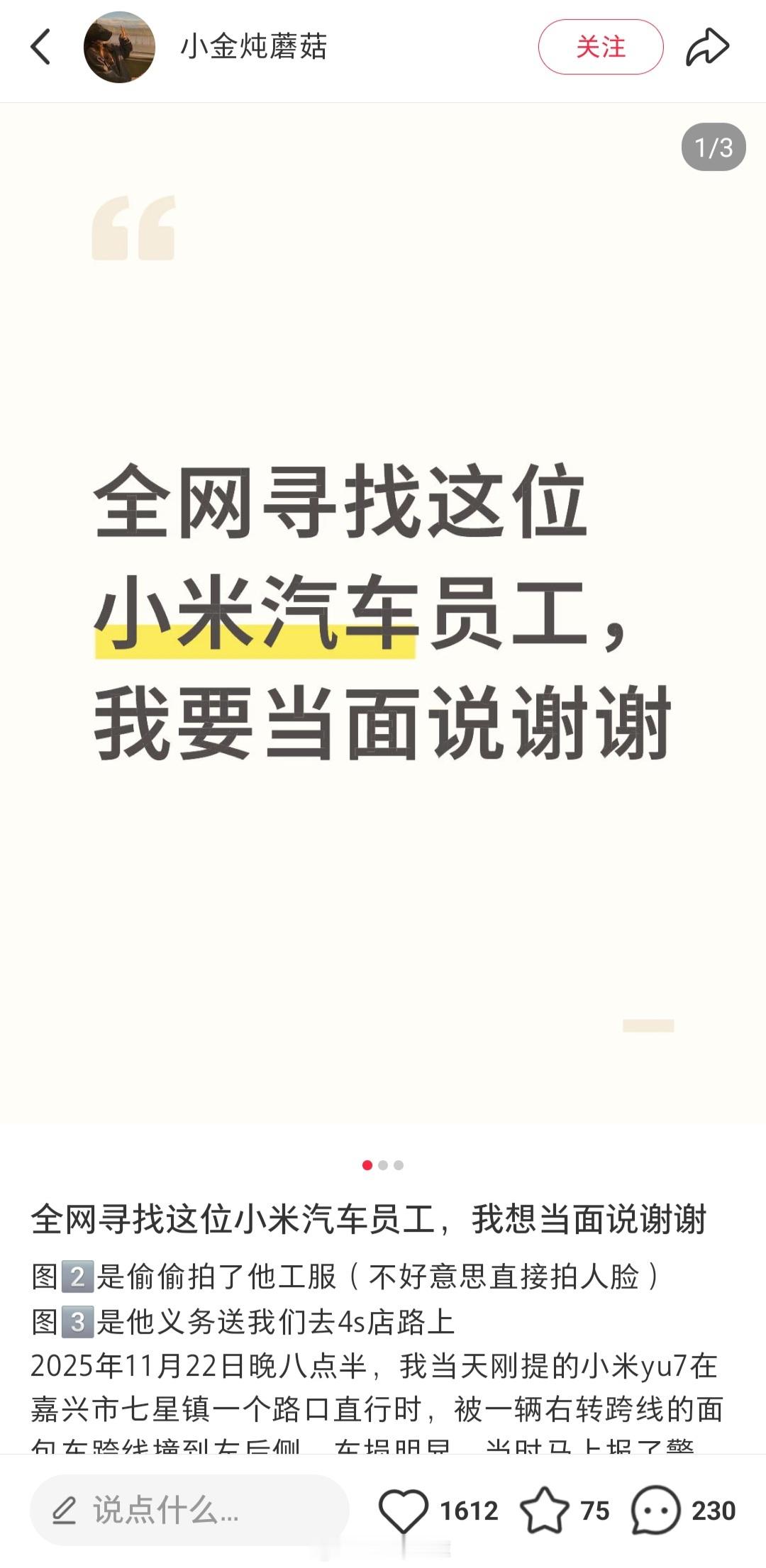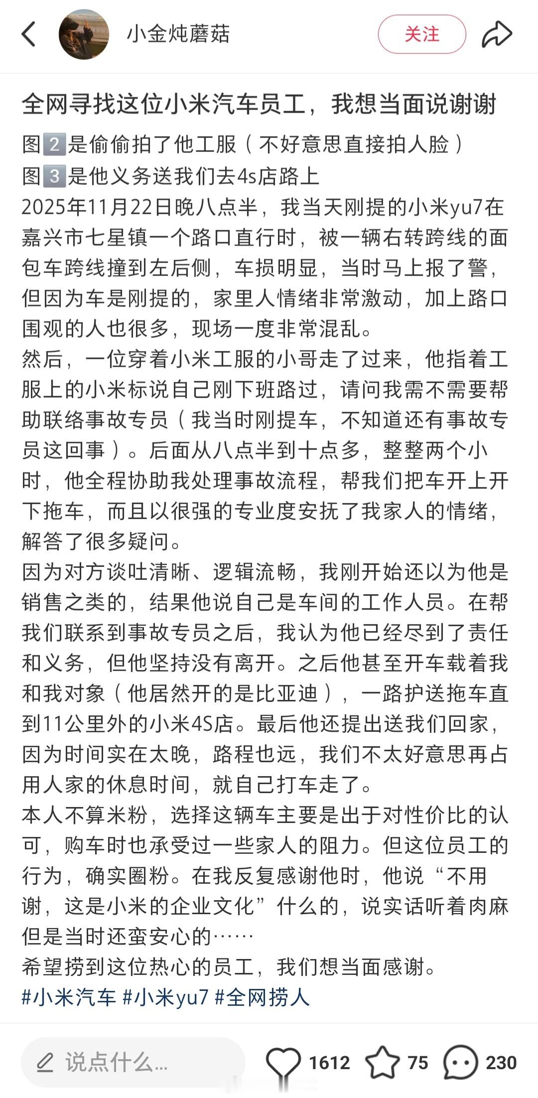 小🍠上看到一个挺暖心的故事,一个刚提车的小米 YU7 车主发生事故,偶遇一位穿着工服的小米车间工作人员,全程协助这位车主处理了事故。愿意做这些分外之事,只因为「这是小米的企业文化」。看来这位热心员工要收到锦旗了