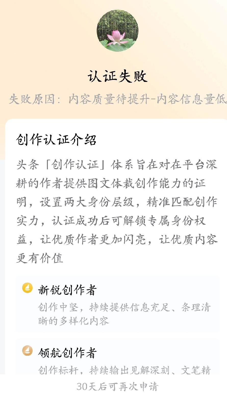 很遗憾微头条新锐创作者第二次申请认证又失败了,三十天后才能再次申请。对本次申请本来信心满满,但还是擦肩而过了。看来小编的写作质量还得好好砺练。今后,我会继续坚持创作,努力提升作品质量,一定在年内申请成功的。