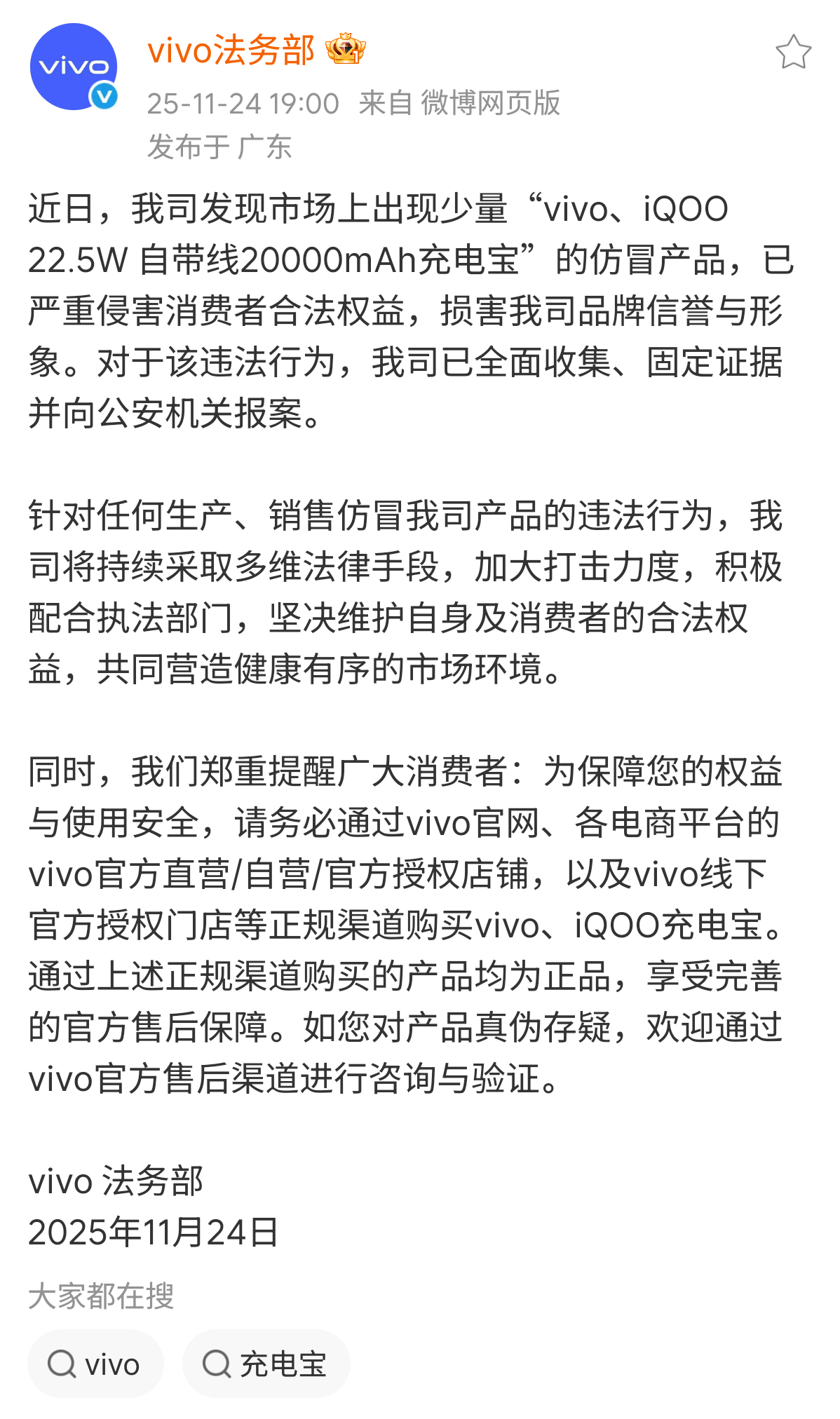 vivo法务发了一条微博:市面上出现了少量“vivo、iQOO 22.5W 自带线20000mAh充电宝”的仿冒产品。大家买的时候注意甄别哈(不过官方没给图片啥的,显得不够清楚)