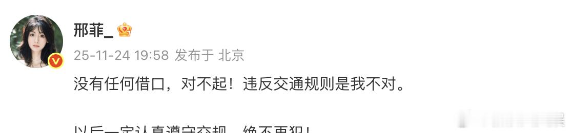 24日,有八卦媒体曝邢菲开车压双实线调头疑违规。刚刚,她发文道歉:“没有任何借口,对不起!违反交通规则是我不对。以后一定认真遵守交规,绝不再犯!”
