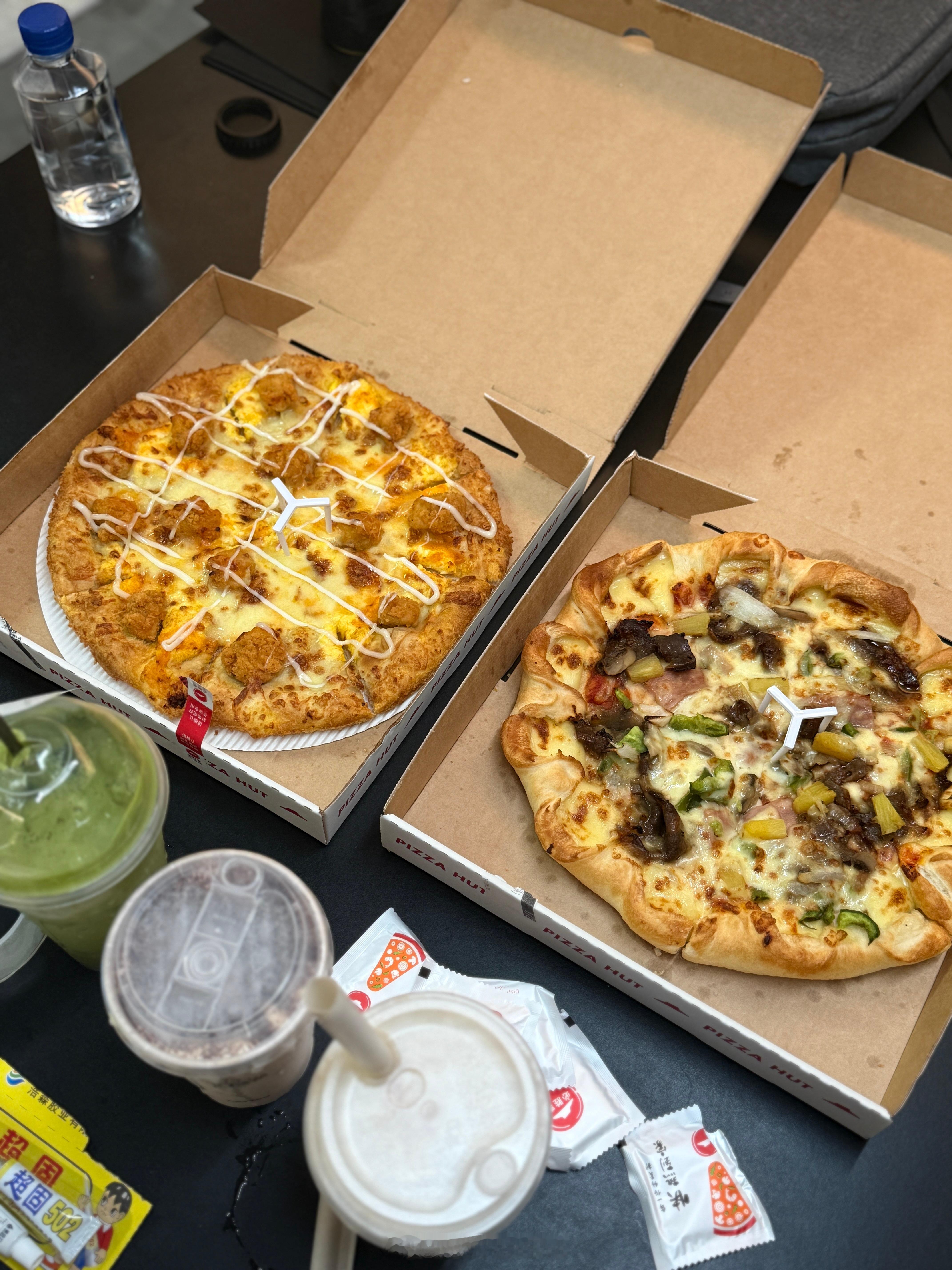 拍完这张照在家里录了10个小时的自我介绍 我要抑郁了。。。买了一堆可爱袜袜嘿嘿三杯厚抹太恐怖了.. 老师给我们点的奶茶披萨 我已经吃过晚饭了 我说我不饿不吃 然后我一个人吃了半个多披萨。。我是猪吗..?