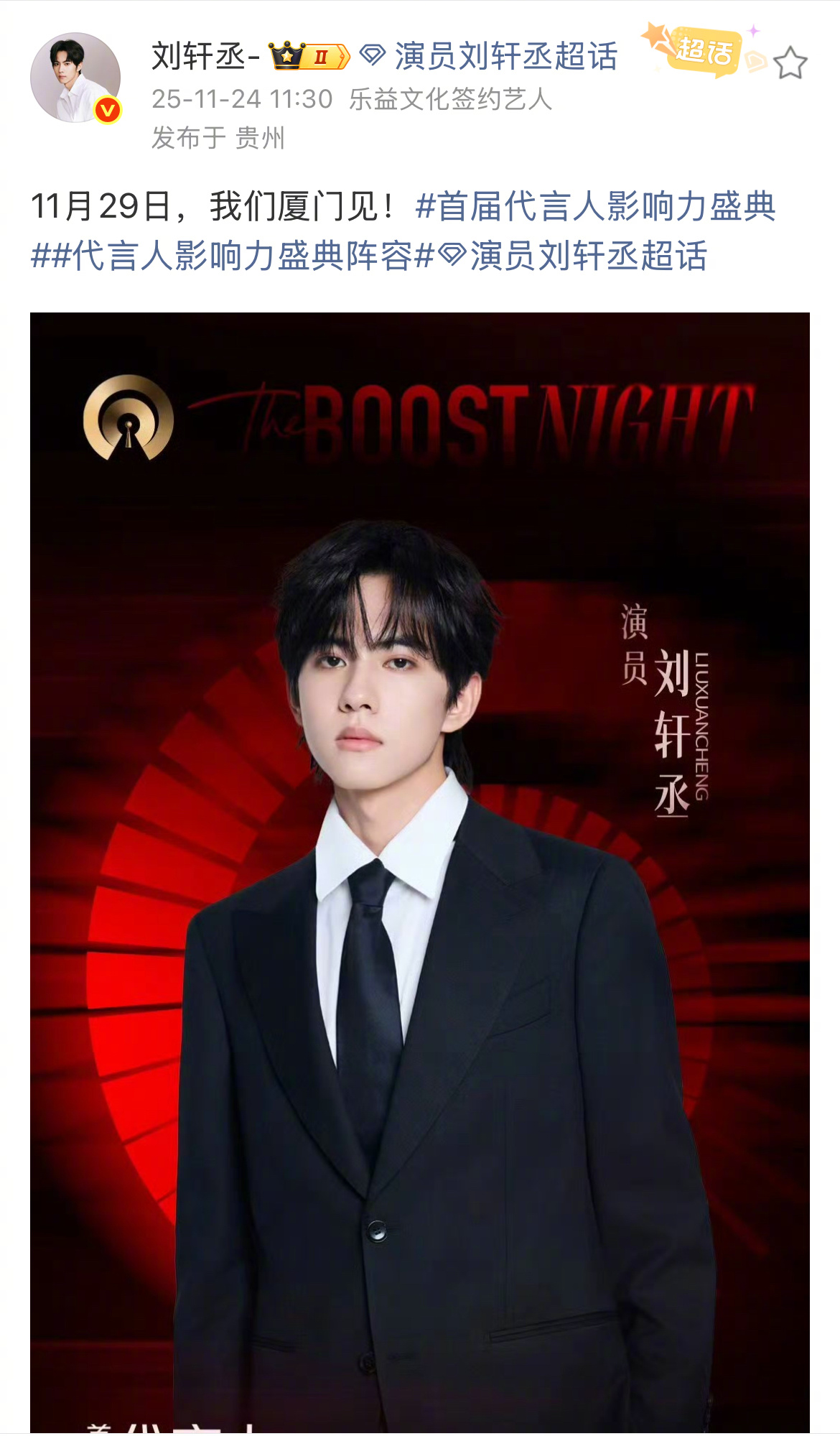 刘轩丞首届代言人影响力盛典正式官宣11月29日期待铮铮