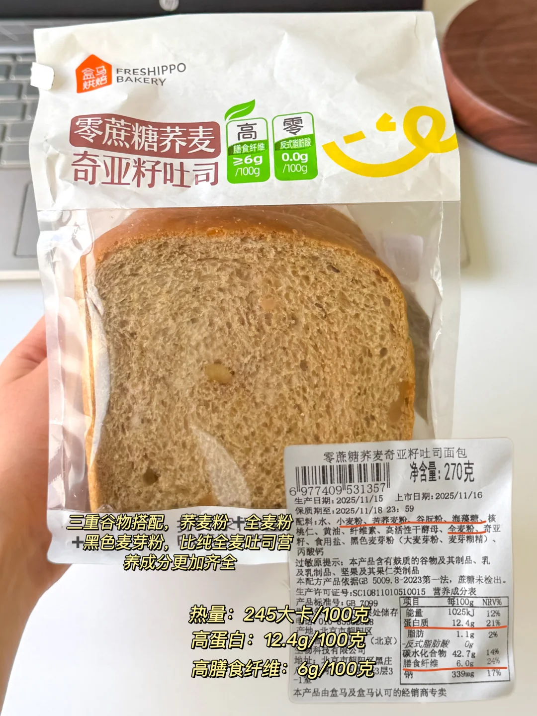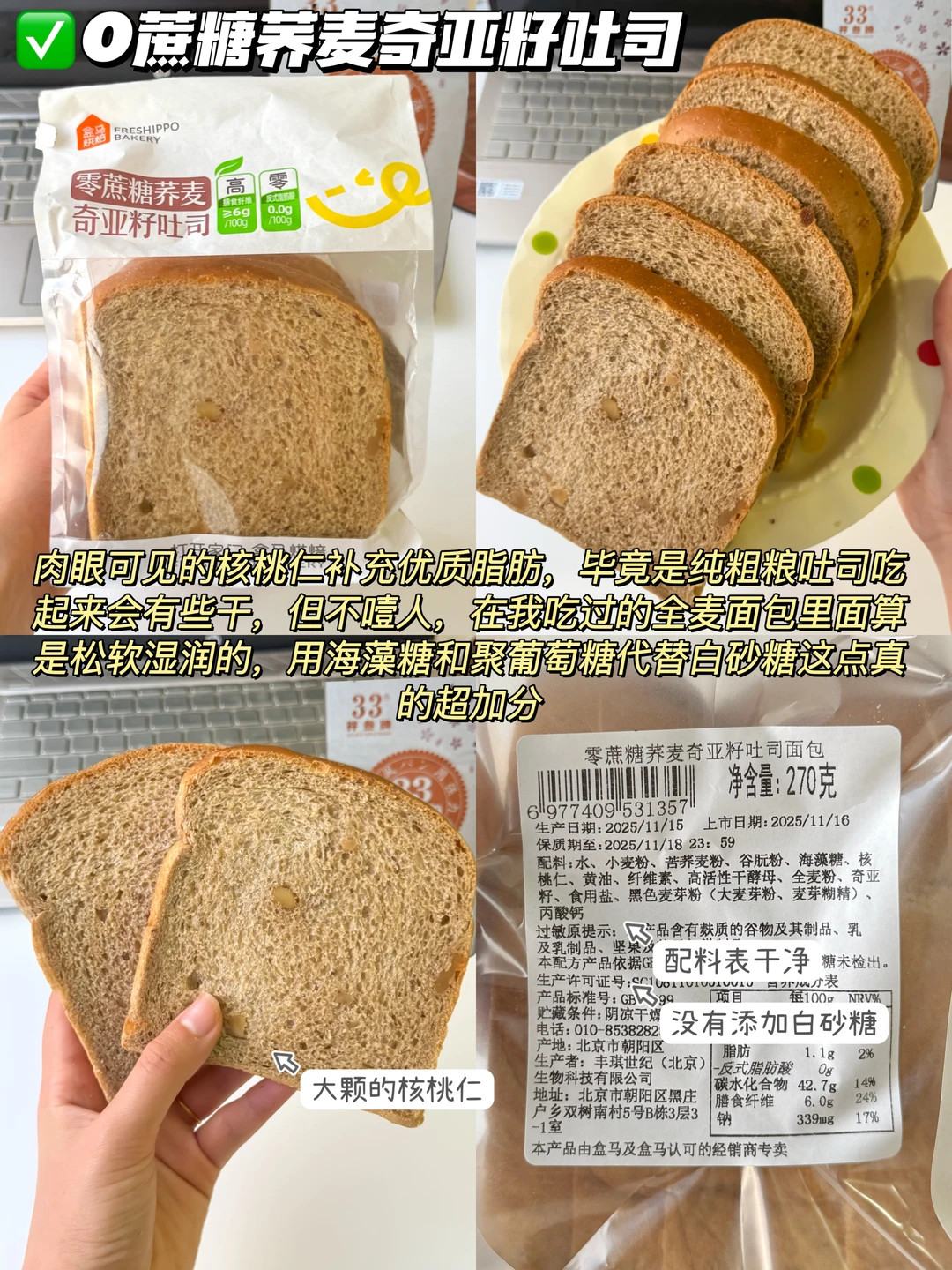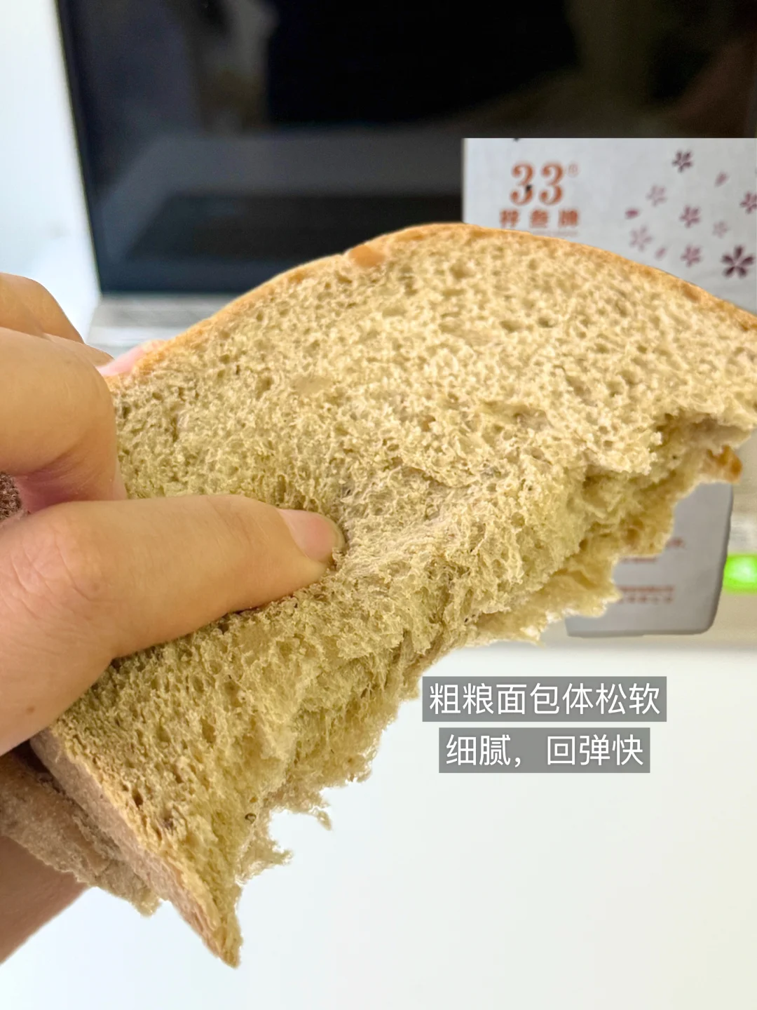 6片12.9性价比也好高,肉眼可见的核桃仁补充优质脂肪,毕竟是纯粗粮吐司吃起来会有些干,但不噎人,在我吃过的全麦面包里面算是松软湿润的,用海藻糖和聚葡萄糖代替白砂糖这点真的超加分,以后自律期主食全靠它啦!