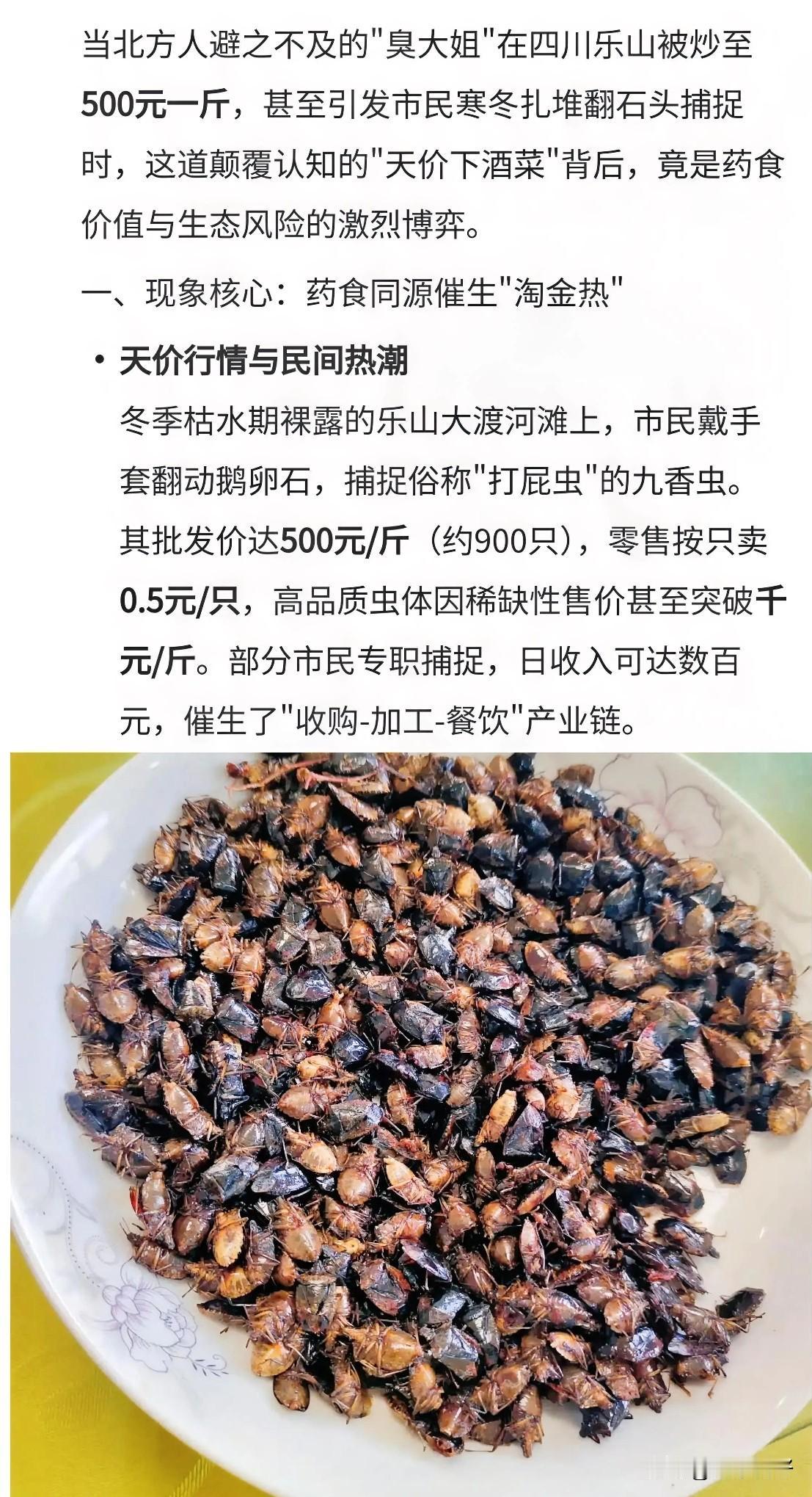 近日四川乐山掀起一股捕捉“九香虫”(俗称臭大姐、打屁虫)的热潮。因其稀缺性和药用价值,野生九香虫价格飙升,鲜虫售价高达500元/斤,高品质干虫甚至突破千元,催生了不少专职捕捉的农户。然而,高价背后潜藏健康隐患。医生紧急提醒:只有特定种类的九香虫经专业处理后才能食用,盲目跟风可能引发中毒! 有人一次性食用20多只后,出现肌肉剧痛、深色尿等中毒症状,紧急送医。野生虫体可能携带重金属,体内臭腺含有毒素,若处理不当或过量食用,易导致肝肾损伤。 怎么吃才安全?记住这三步! 想安全尝鲜?专家支招: 1️⃣ 冷水淹死:将活虫放入冷水中窒息致死,防止臭腺分泌物污染。 2️⃣ 沸水去臭腺:用沸水焯烫,彻底清除毒素和异味。 3️⃣ 油炸3分钟以上:高温油炸确保虫体熟透,杀灭潜在病菌。 注意:单次食用不超过10只,过敏体质、肝肾疾病患者及孕妇儿童切勿尝试! 我们那边叫它:“打屁虫”,记得小时候勤工俭学就是去抓这个虫,那时候价格就比较高了,现在又流行起来了。“臭大姐”虽价高味美,但安全第一!勿盲目追逐野味,规范处理、适量食用才能守住健康。你有抓过或吃过这种虫吗?