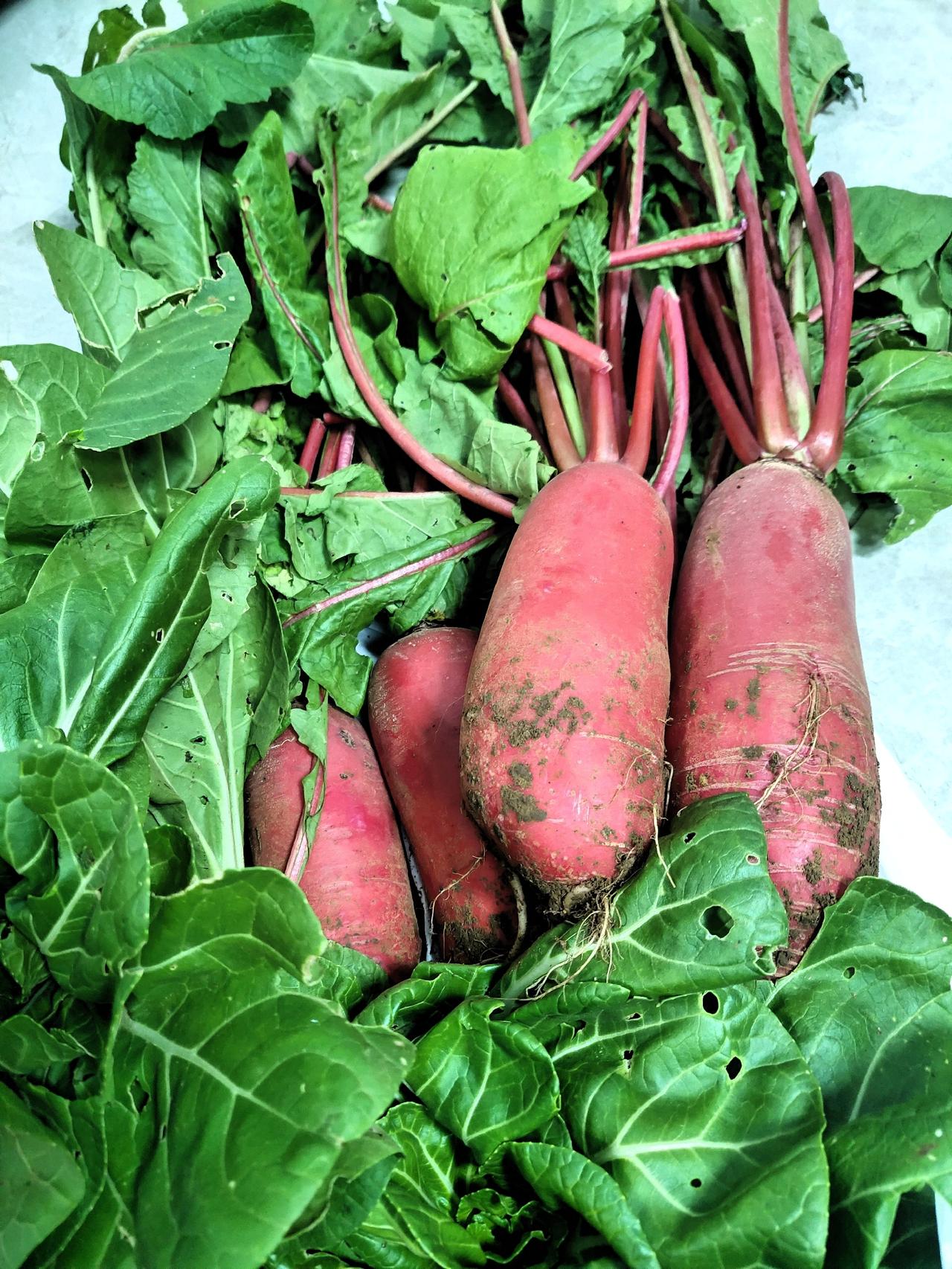今天去古惠济寺看古银杏,看完以后,老同志坚决要求拐到去年排队等农民挖菜的菜地,再像去年一样弄点新鲜地头菜回家。 农民夫妻俩还在,看我们过去就打招呼,想要点什么菜,萝卜大蒜矮脚黄菠菜,自己选帮你们拔。男的先带着我们去砍青菜,然后又带我们去拔萝卜,我自己选的萝卜自己拔,都忙出汗了,看着红彤彤的萝卜,连萝卜缨子都舍不得掰。 回家赶紧把青菜洗洗炒了一盘,虫眼的青菜当个宝,图的就是这一个半小时从地里到餐桌的新鲜。 感觉这也可以参照四川偷甘蔗,先偷后抓再罚,偷一包菜十块钱,肯定也有很多人喜欢玩。
