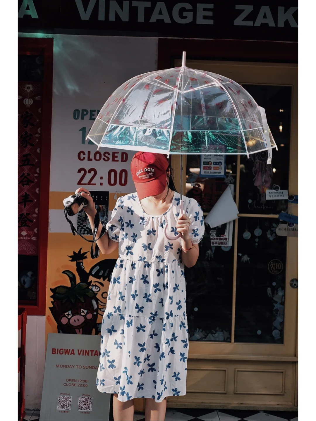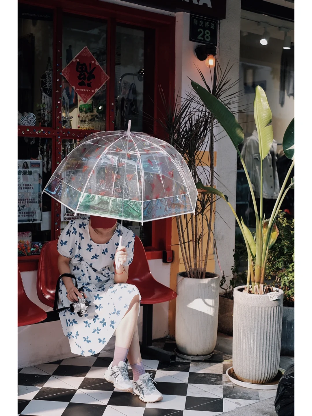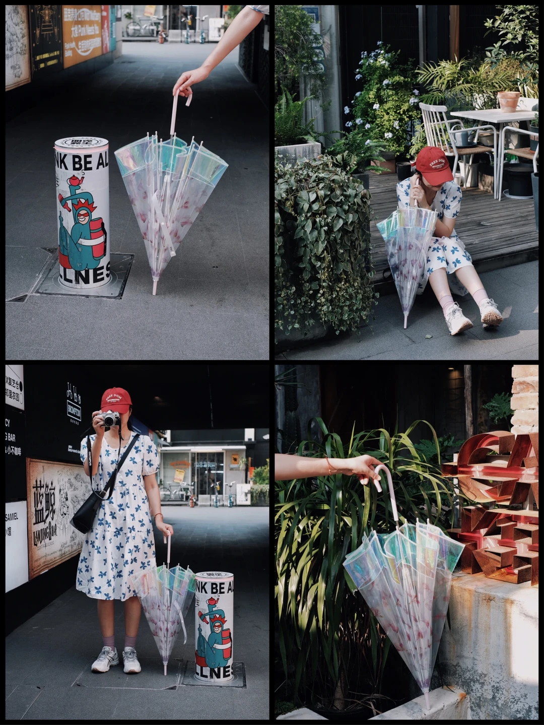 放假和朋友一起拍照太开心啦~带上了新入的Wpc.透明伞,去了一直想去的古着店,伞拍照好看,质感也8错~ 调色:醒图 滤镜:胡桃木 智能优化on 亮度-25 对比度+19 锐化+34 高光-39