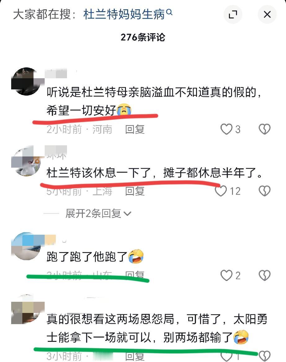 突发脑溢血!杜兰特为什么缺席比赛?网友:他妈妈住院了,好像是脑溢血,要做手术。 明天,火箭客场挑战太阳,赛前,据报道,杜兰特将不能出战,不仅如此,杜兰特还继续缺阵11月27日火箭客场挑战勇士的比赛。也就是杜兰特将连续缺战两场比赛。 那杜兰特为什么要缺阵呢?杜兰特只是说因为处理家务事,其他的并没有说。许多热心的球迷就开始猜测了。 而就在今日早些时候,就有网友从外网了解到,杜兰特缺席的真正原因是他的妈妈生病住院了。 这位网友说:杜兰特的妈妈生病住院一周,明天手术,杜兰特请假照顾母亲,应该在火箭对阵爵士的时候就归来了。 此消息一出,有网友继续透露,杜兰特的妈妈是突发脑溢血。 当然,无论怎样,杜兰特说处理家务事,那肯定是家里有很急的事情。不管是什么事情,愿杜兰特一家健康、平安,期待杜兰特早日归来。
