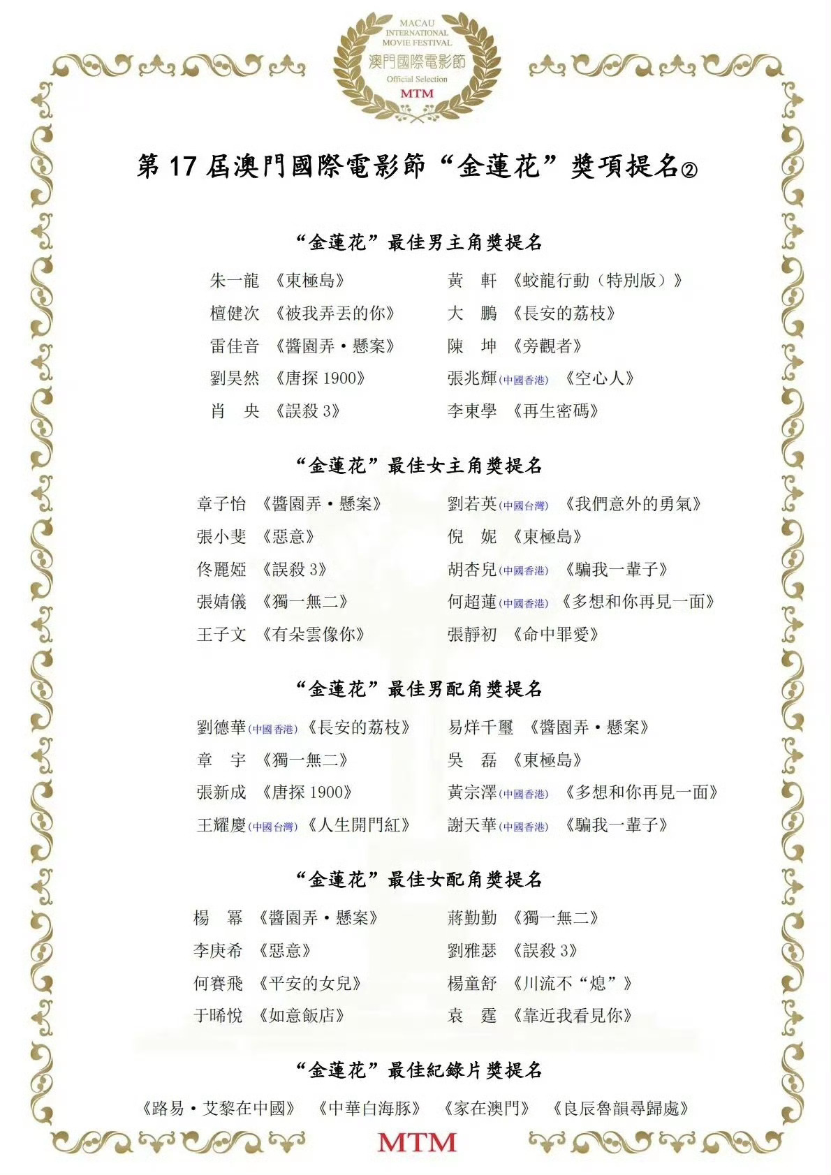 第17届澳门国际电影节“金莲花”奖项提名恭喜杨幂王许梅《酱园弄·悬案》获得“金莲