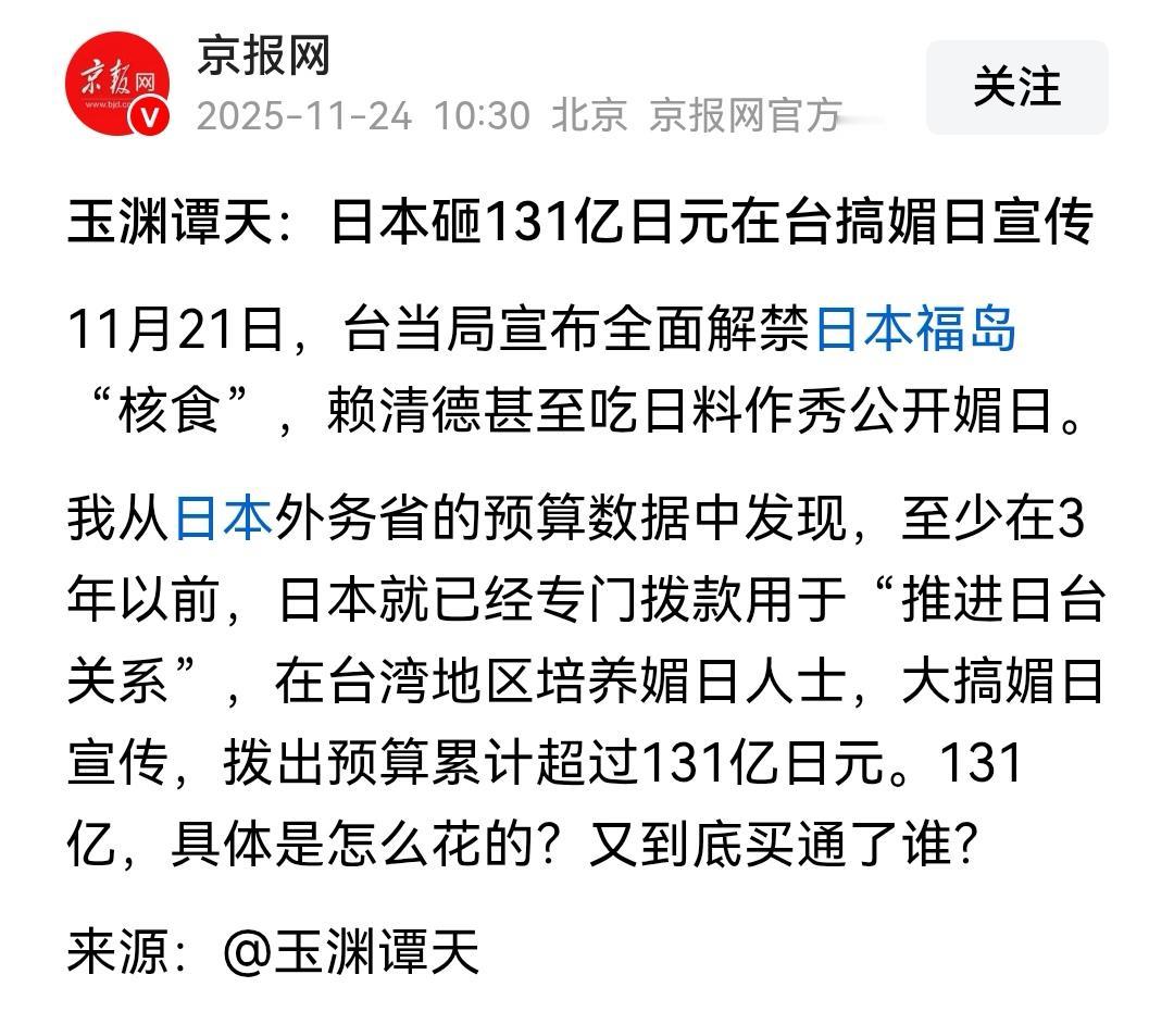 快讯!快讯! 惊爆!日本砸131亿日元培植台“媚日”傀儡 11月24日,据《上观新闻》转“玉渊潭天”报道,日本外务省至少在3年前,就专门拨款131亿日元(6.3亿人民币),用于“推进日台关系”,在台湾地区培养媚日人士,大搞媚日宣传。资料显示,这笔巨款用途为“深化日台民间纽带”,实际用于资助日语教材出版、亲日网红孵化及历史纪念活动,实为“文化渗透”。 [刀]主要龌龊事:1.派送“滤毒”书籍,将篡改真实历史,否定侵略,否定慰安妇等内容的书籍投放学校,企图用掩盖事实的手段,美化日本行为。 2.普及资助“日语特色课程”,加紧对“媚日”文化输出,毒台未成年人。 3.网络散播谣言和注入日本毒素,孵化培养200名网红达人,宣扬日本文化,每人每月30万日元的创作补贴。 4.加强基础设施建设,剔除侵略元素。如,日本“记忆传承协会”资助拍摄《台湾高座会物语》,将二战期间强迫赴日劳作的台湾少年工重塑为“技术留学生”。 5.资助建设网络,实时传输日本动漫和历史叙事,用糟粕的文化毒害青少年。 6.加强街头、巴士、宾馆和餐饮日本文化宣传,贬低丑化大陆社会现状,实时报道日本新闻。 7.贿赂“台独”政要和“台独”分子,让其迷失价值观,成为金钱的奴隶,肝心涂地成为真正的汉奸。 [狗头]讲几句:日本把台湾作为制约中国崛起的一枚重要棋子,觊觎台湾已久,想尽一切办法鼓动“台独”分裂,并借台湾得天独厚的地理位置为其发展海上贸易,以及转运生活物资提供方便。 这种经费投资,搞“媚日”文化侵略如同“毒品”输送,毒害之深,影响极坏。从前期中国暂停日本水产,台湾民进党当局以赖清德为首的政要主动现身“叫板”大陆,做宣传吃“日料理”,再到台湾生产印有“台日”友好的高市早苗巧克力,足以见的这股“媚日”风在台湾已经成为气候,根深之久,日本的阴谋正在得逞。 邪不压正。打击日本“媚日”文化输出,首先,要深刻揭露其罪恶行径,通过网络媒介等途径让台湾民众认清危害。其次,发动台湾爱国者人士坚决抵制,炮轰日本和“台独”分子勾连的罪行。最后,加强中华文明优良传统文化输出,用正义正能量压倒歪风邪气。赖清德声援高市早苗 台民众愤怒抗议