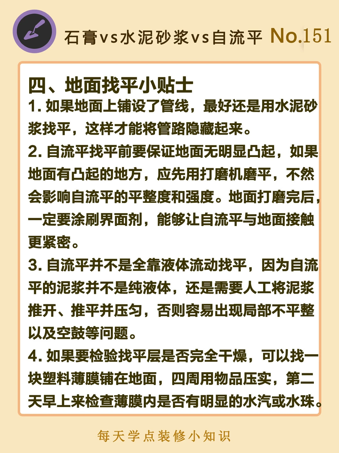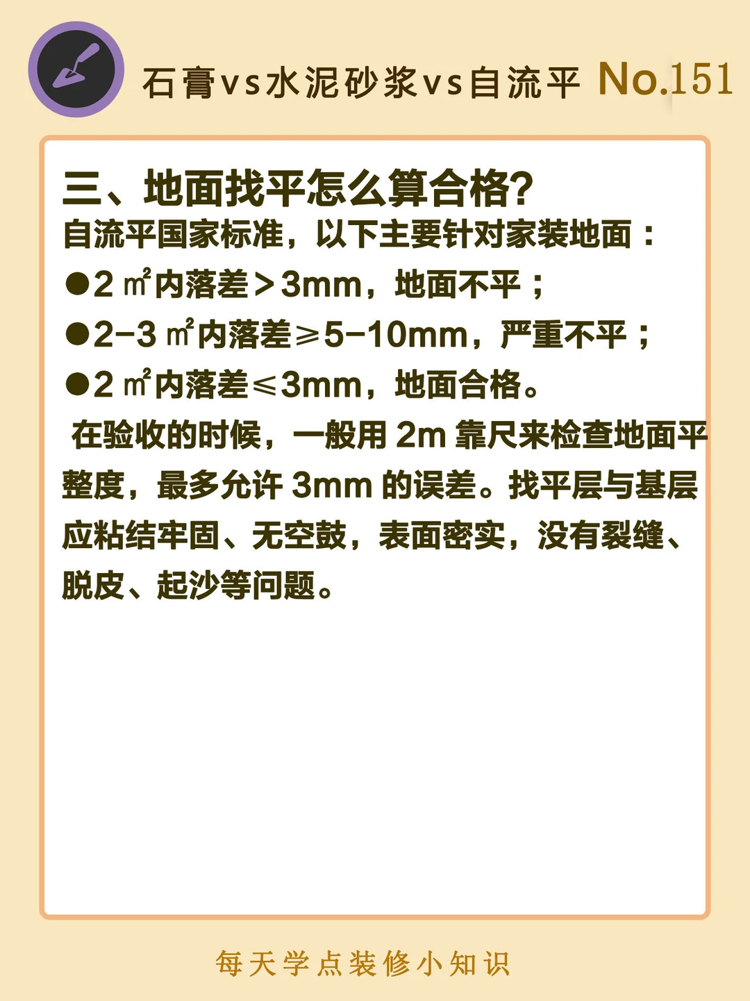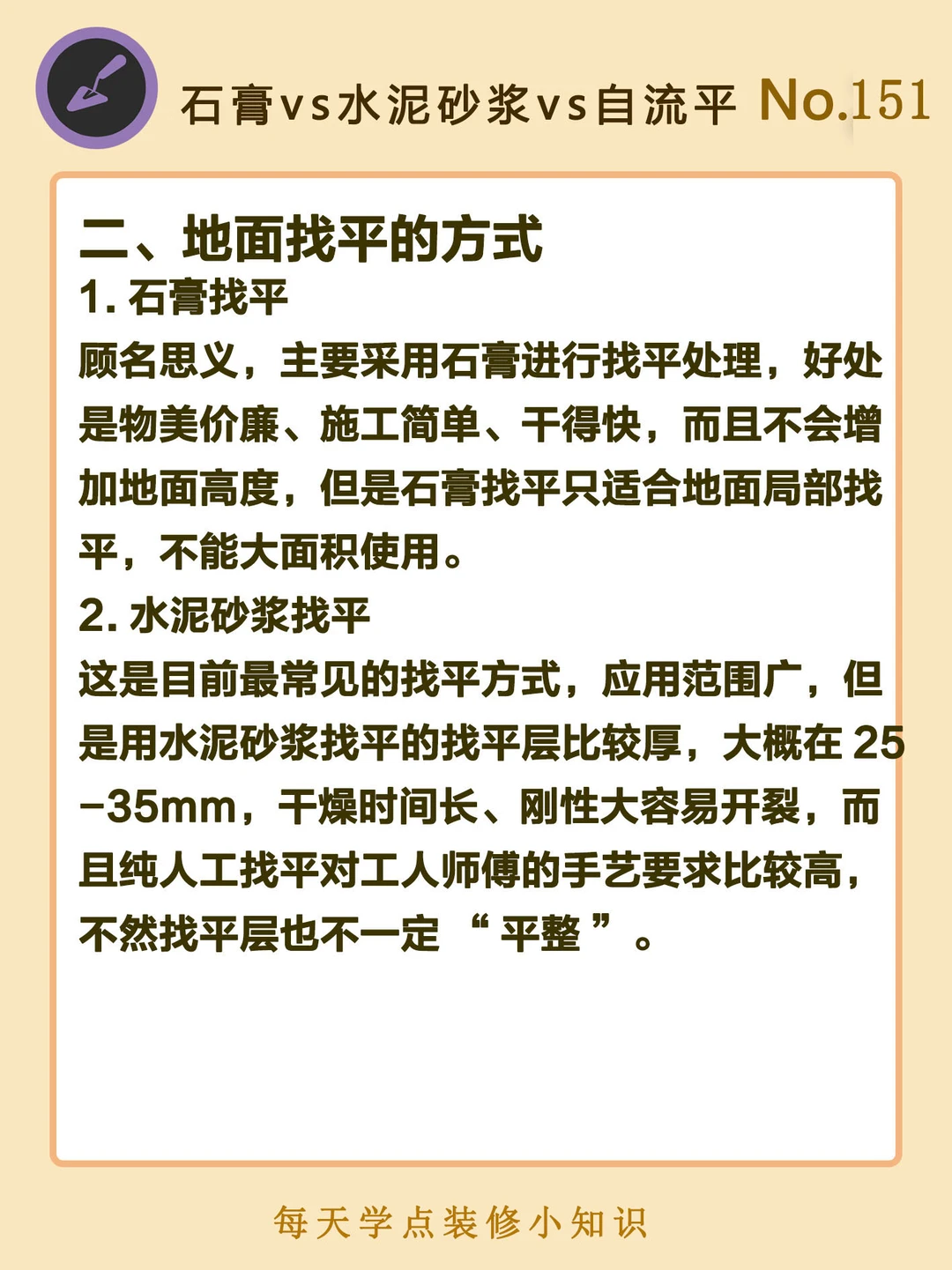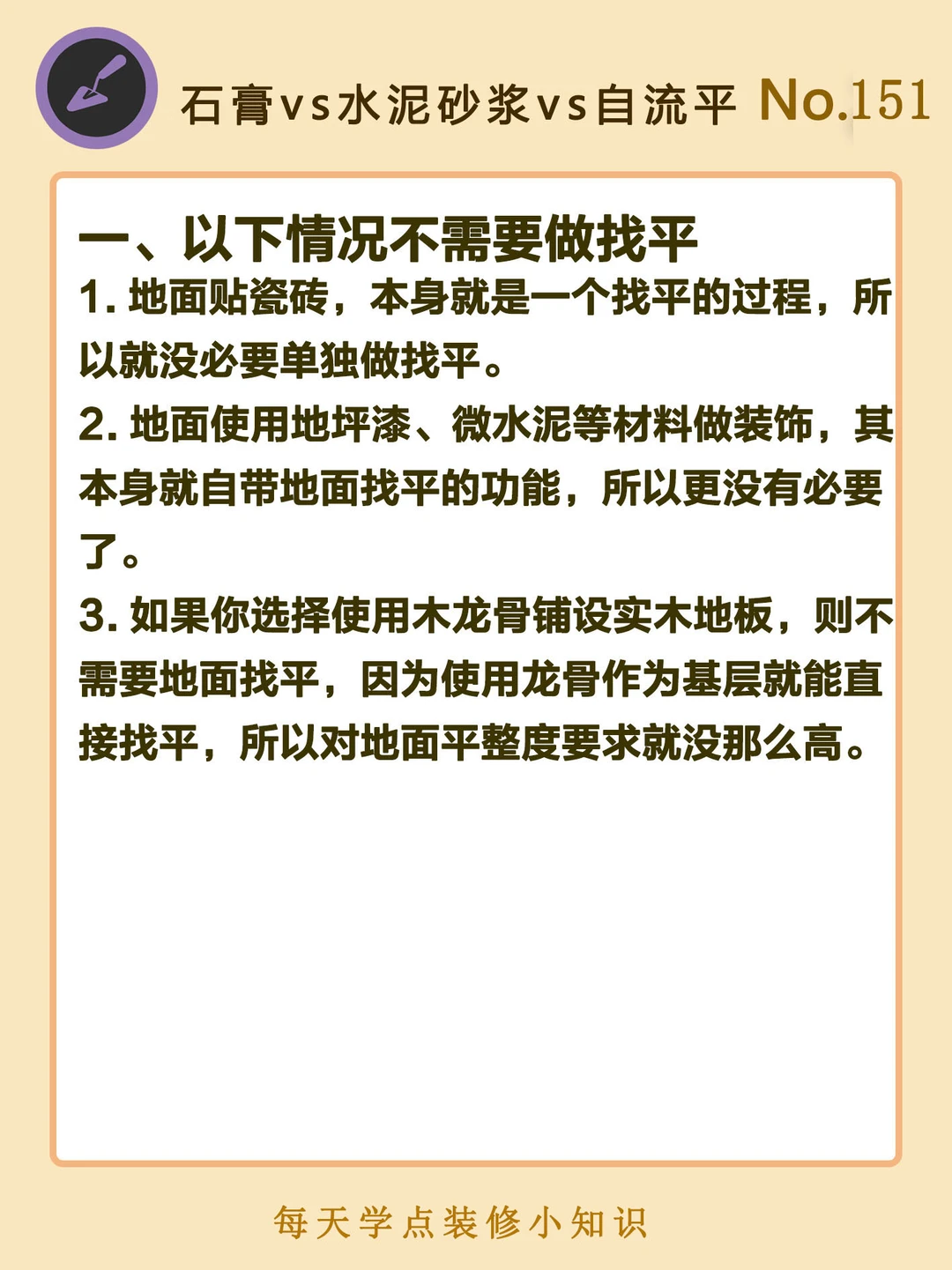 [大笑R] 一、以下情况不需要做找平 二、地面找平的方式 1.石膏找平 2.水泥砂浆找平 三、地面找平怎么算合格? 四、地面找平小贴士